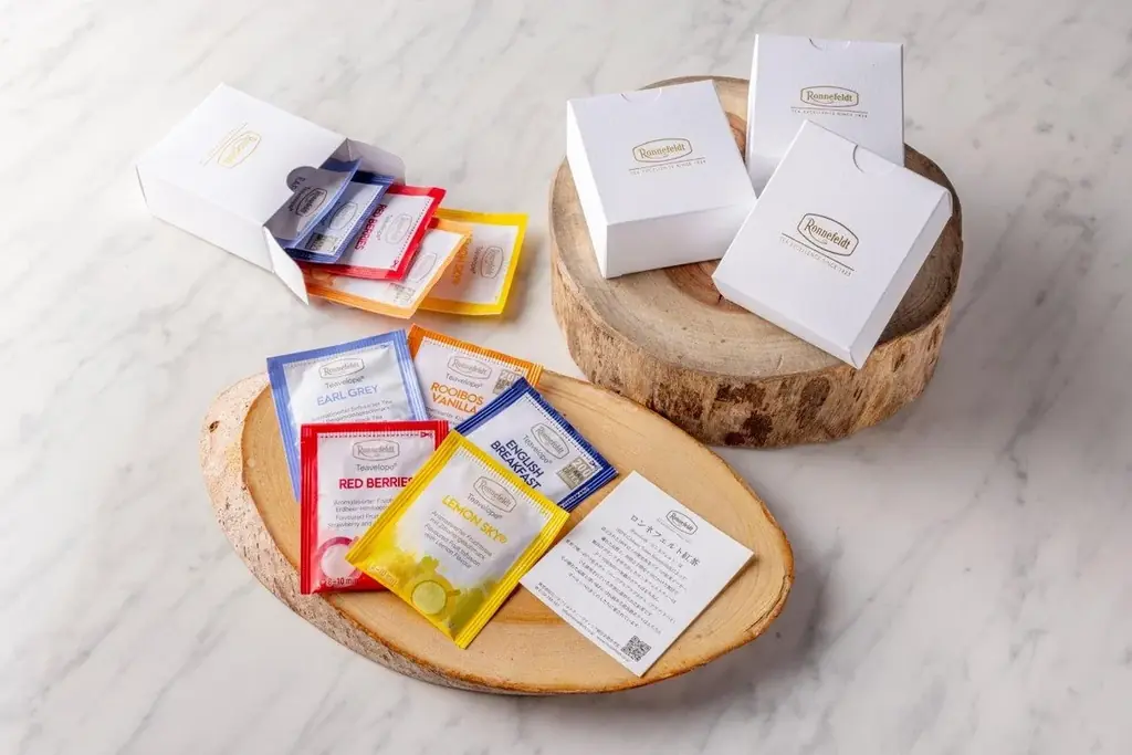 ドリンクはコーヒー類(エスプレッソ、カフェラテ等)に加えて、ドイツ老舗紅茶ブランド「ロンネフェルト」の14種類の紅茶をフリーフローで用意。ティーの香りを試せる茶葉のテイスティングボックスが用意され、お好みで選んで楽しめます。