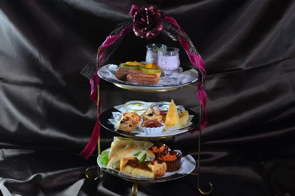 カリテレモンが用意する「不思議の森のアフタヌーンティー」は、不思議の国のアリスをイメージしたややダークな世界観を表現したセットです。写真映えを意識した演出が施され、雰囲気重視の構成になっています。