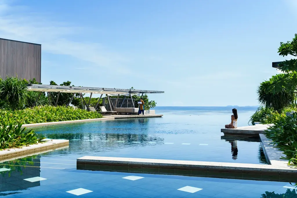 星のや沖縄は「グスクの居館」をコンセプトに、海岸線に沿って配置された敷地、海に沈む夕陽を望むインフィニティプール、色彩豊かな畑や庭、沖縄文化を体験する道場などを備えたリゾートです。プールは加温式で冬でも温かく利用でき、浅瀬エリアで軽く水に入ることも可能です。プールサイドのソファやビーチベッド、南国植物による空間演出により、落ち着いた時間を過ごすことができます。
