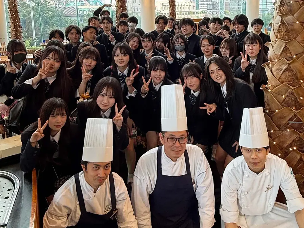 今年も神奈川県立商工高等学校とのコラボレーションが実施されます。横浜ベイホテル東急のカフェ トスカ シェフ、辻とペストリーシェフの田中が2025年春から数回にわたり同校を訪れ、食材の知識やメニュー開発の指導を行いました。生徒が考案した案をホテル側がブラッシュアップし、全6品をブッフェにて提供します。