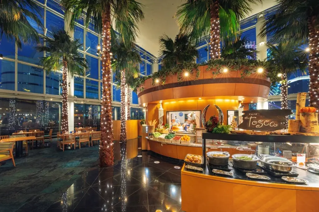 会場はホテル2階のカフェ トスカで、店内の大きなガラス窓からはみなとみらいの夜景が一望できます。天井高10メートルの吹き抜けと24本のパームツリーが配され、海を意識した水の演出を感じながら、シェフが用意する季節感のある皿を選べる構成になっています。