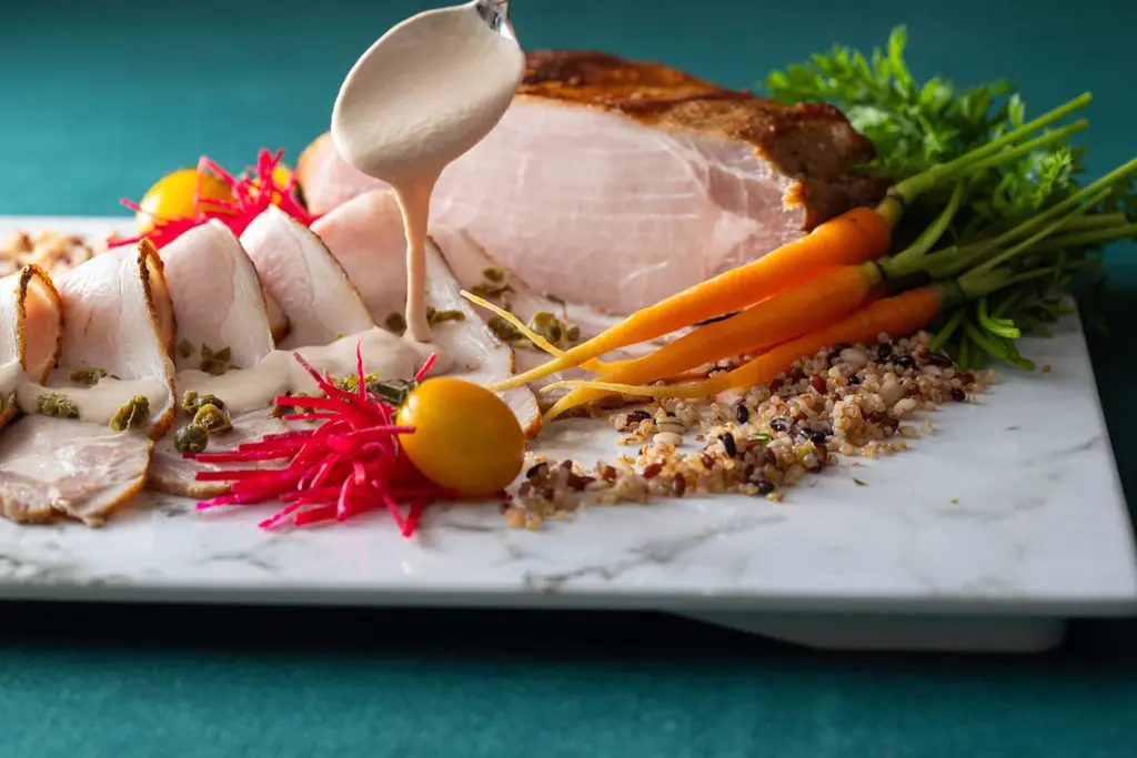 - 冷製&温製の多彩な料理群(例: しっとり焼き上げた冷製ポーク トンナートソース、シュリンプと季節野菜のカクテル、牛肉のハーブパン粉焼き、蟹グラタンピザ、アッシェ パルマンティエ など)