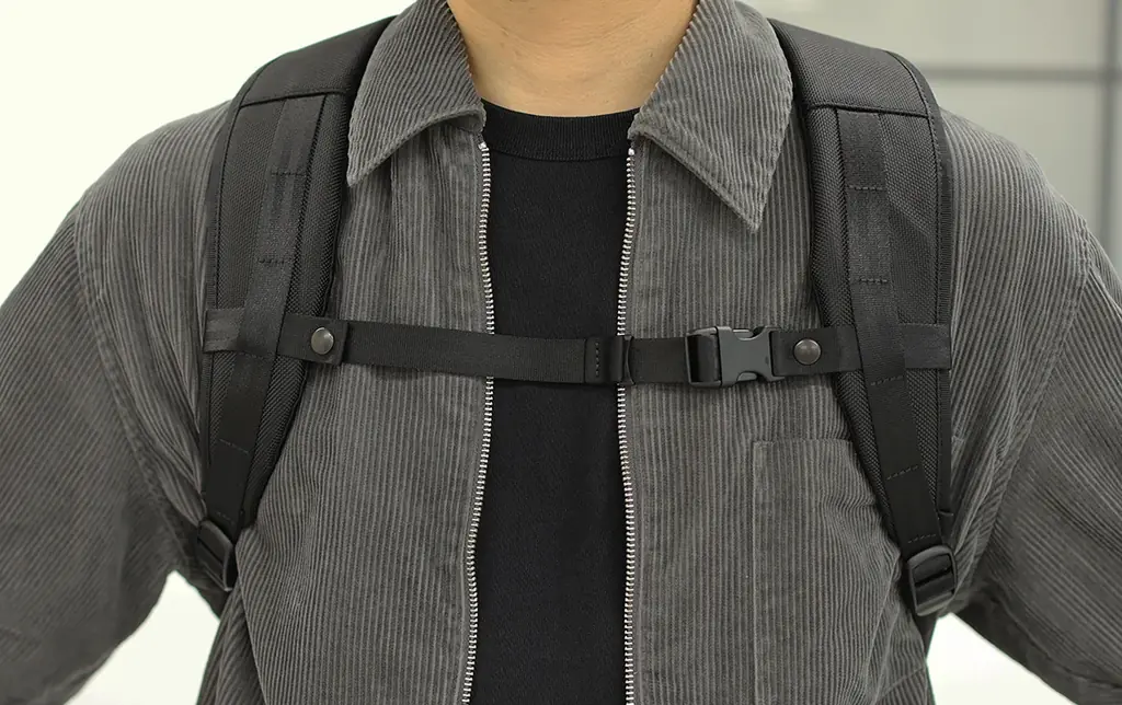 肩紐のズレ落ちを防止し、歩行時のバックパックの揺れを抑えるチェストサポートを搭載しています。背中・肩・胸を連結することで高い一体感を生み出し、アクティブな動作でも安定した背負い心地を保ちます。