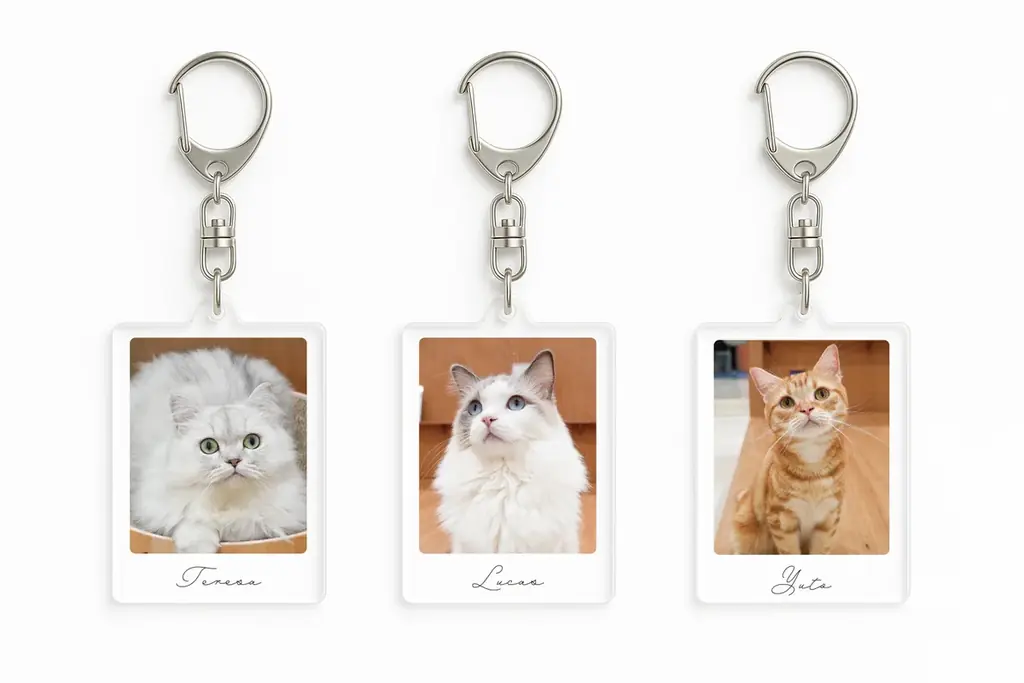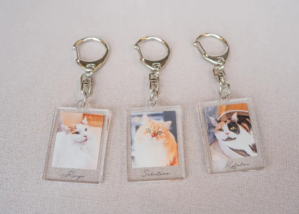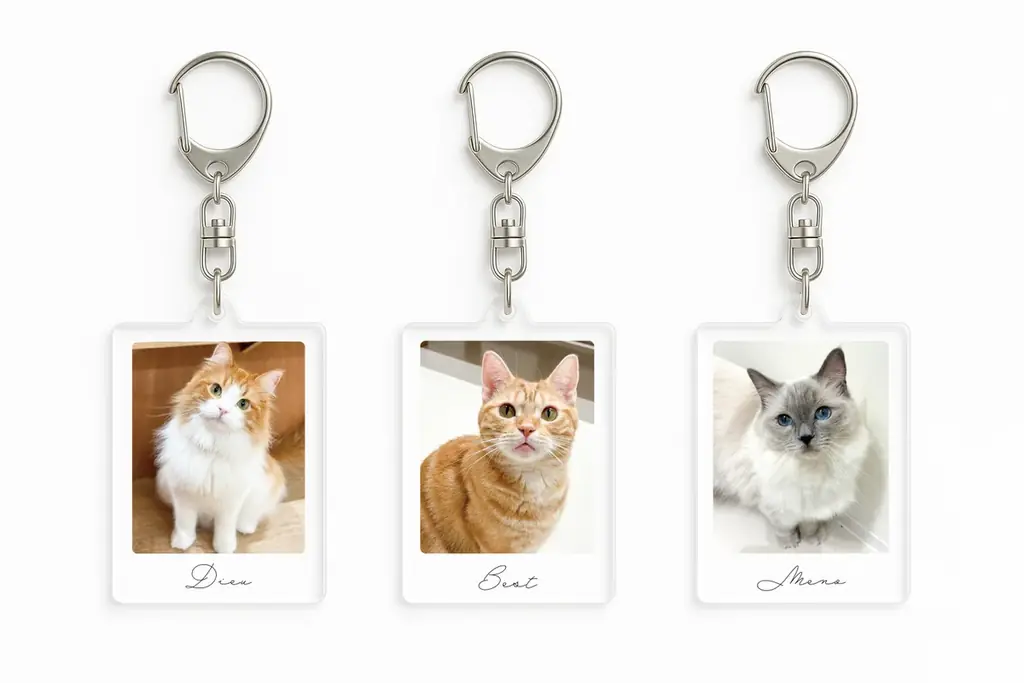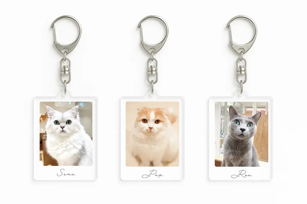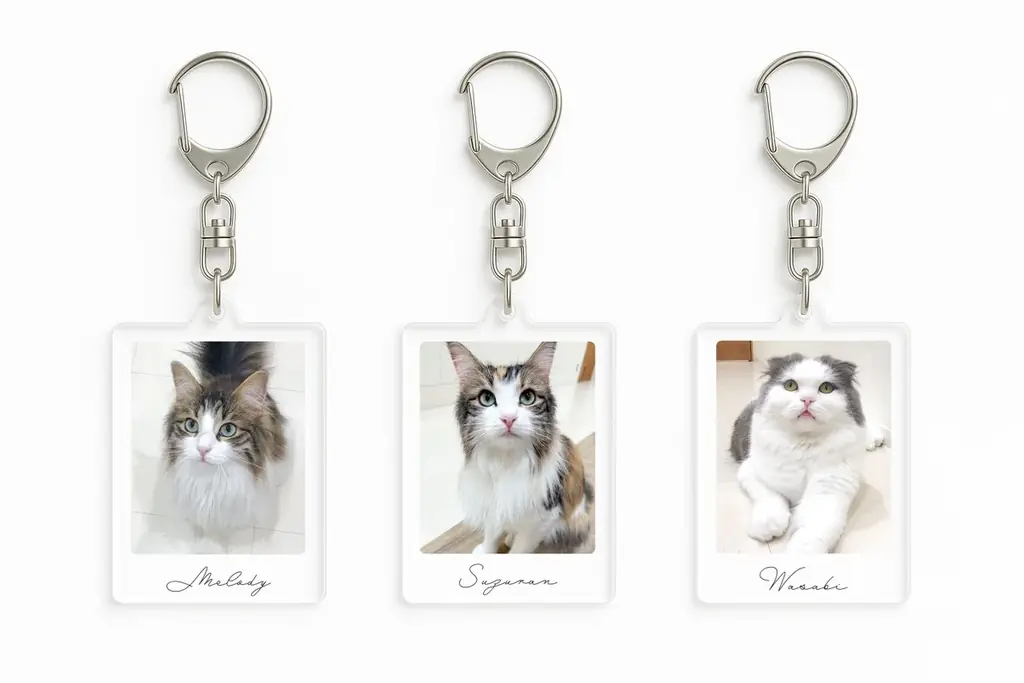 チェキ風アクリルキーホルダーは、各店舗の1位〜3位のネコがチェキ風デザインで展開されるアイテムです。チェキの「ときめき」とキーホルダーの「手軽さ」を融合させ、バッグや鍵、お部屋のインテリアとしても使える設計です。