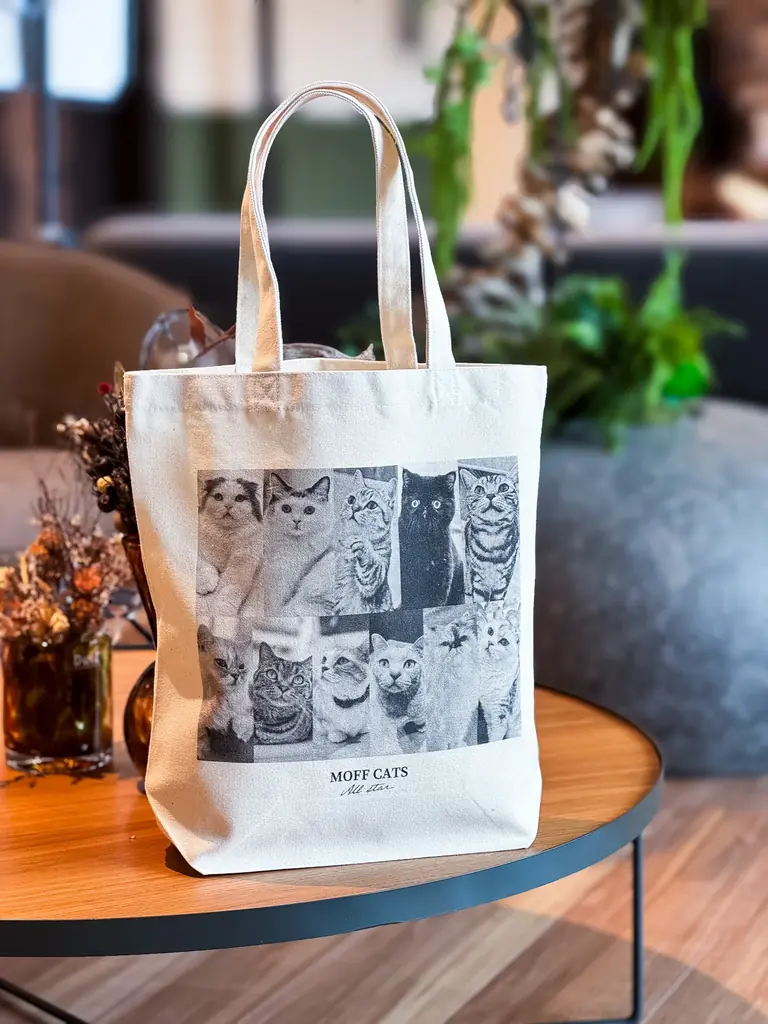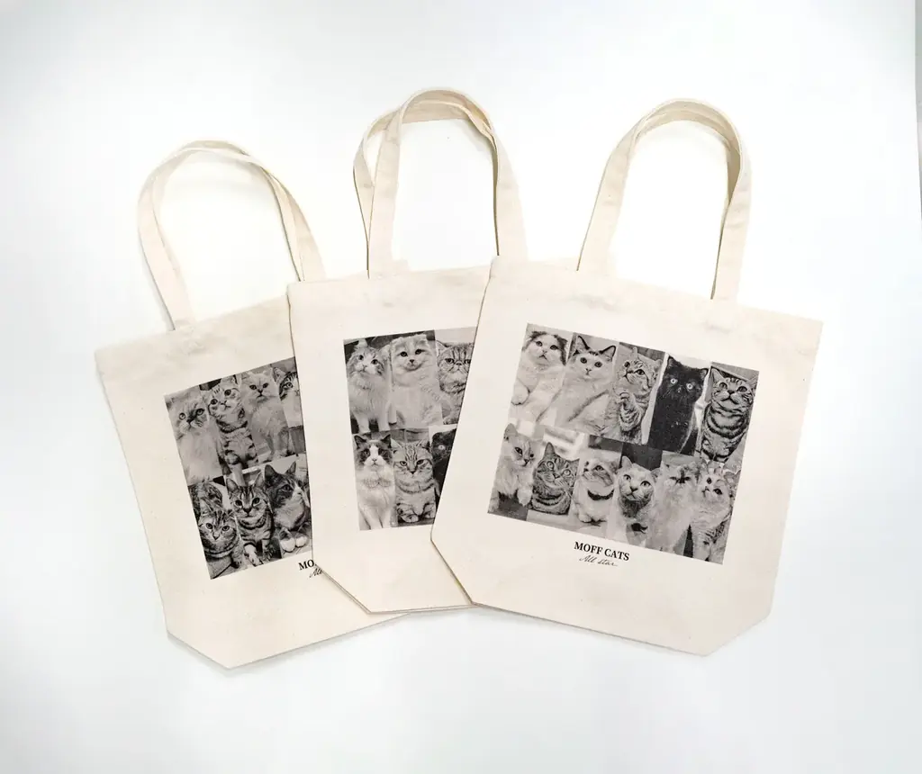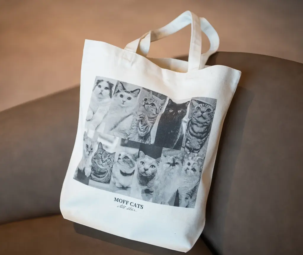 トートバッグは『MOFFネコ総選挙(2025年開催)』でMOFF全34各店舗の頂点に輝いたネコたちが勢ぞろいするデザインです。全34頭の人気ネコが3種のデザイン(12頭/11頭/11頭)に分かれて登場します。