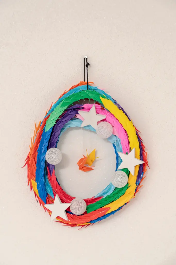 外側をカラフルな折り鶴で囲み、内側には様々なオーナメントを敷き詰めて多様性に満ちた「平和な世界」を表現しました。