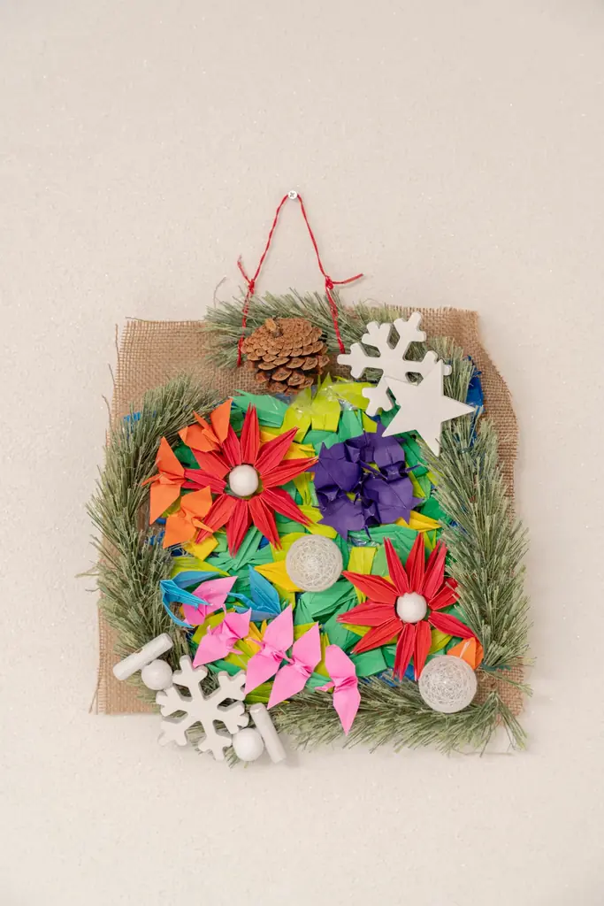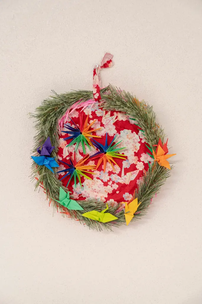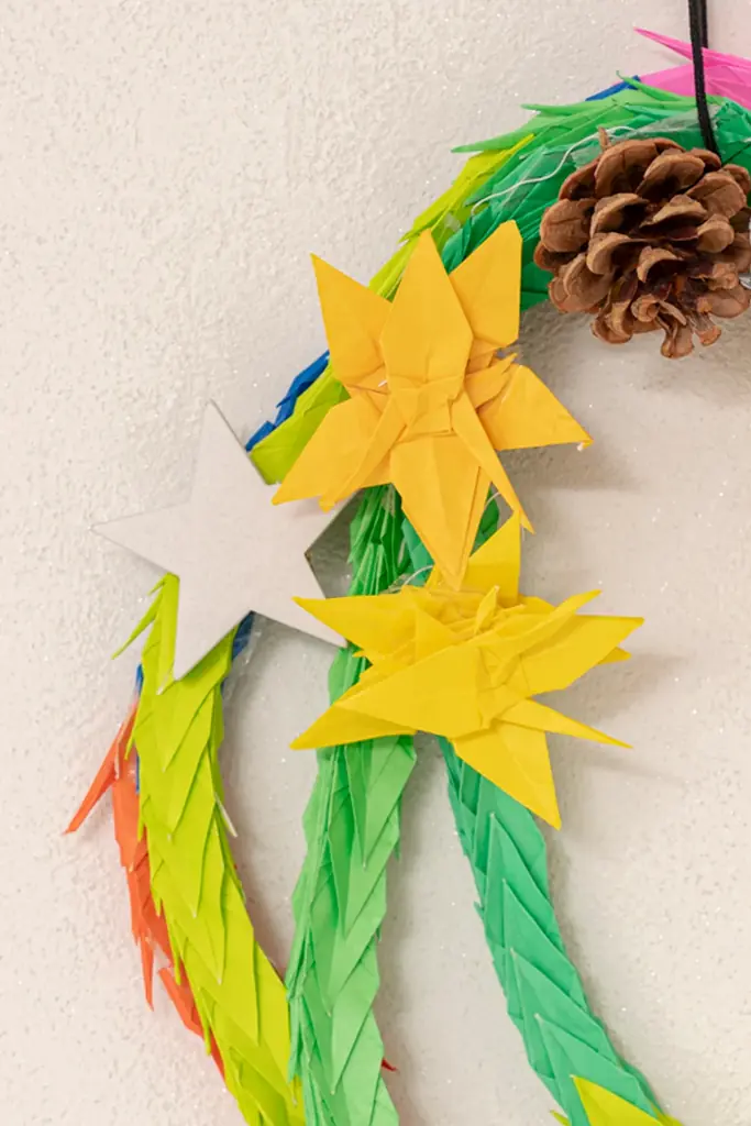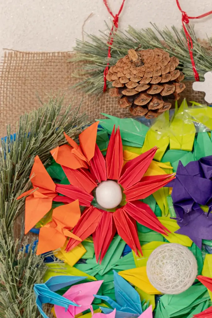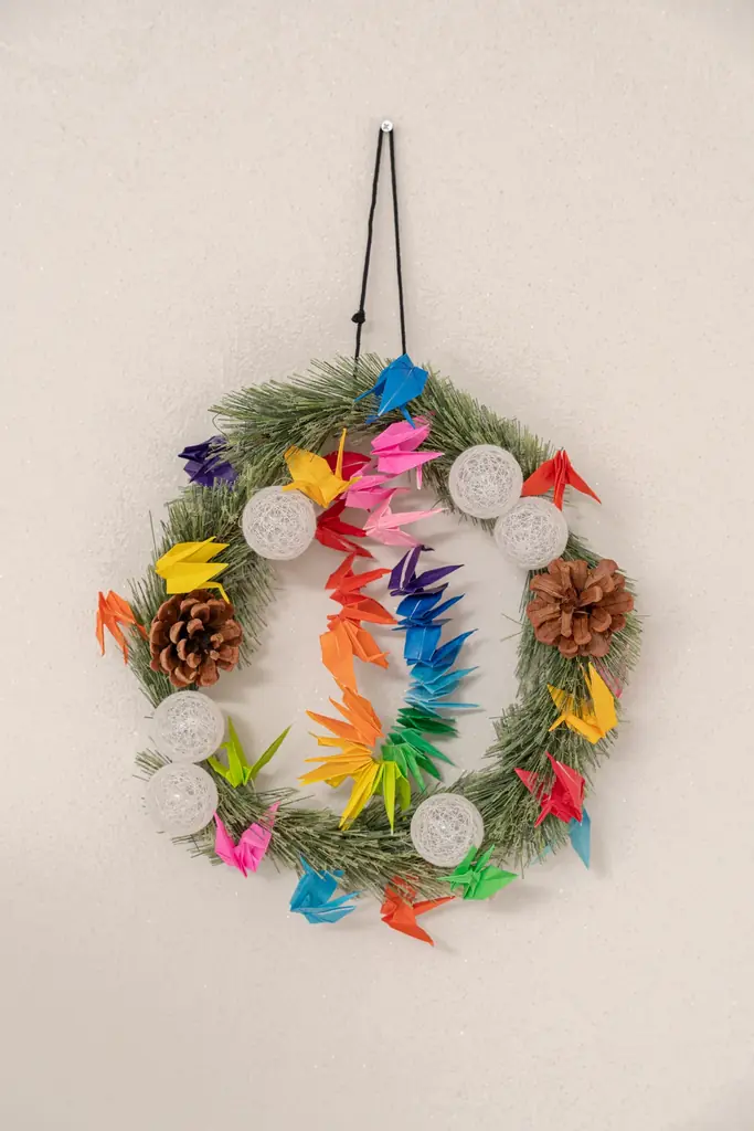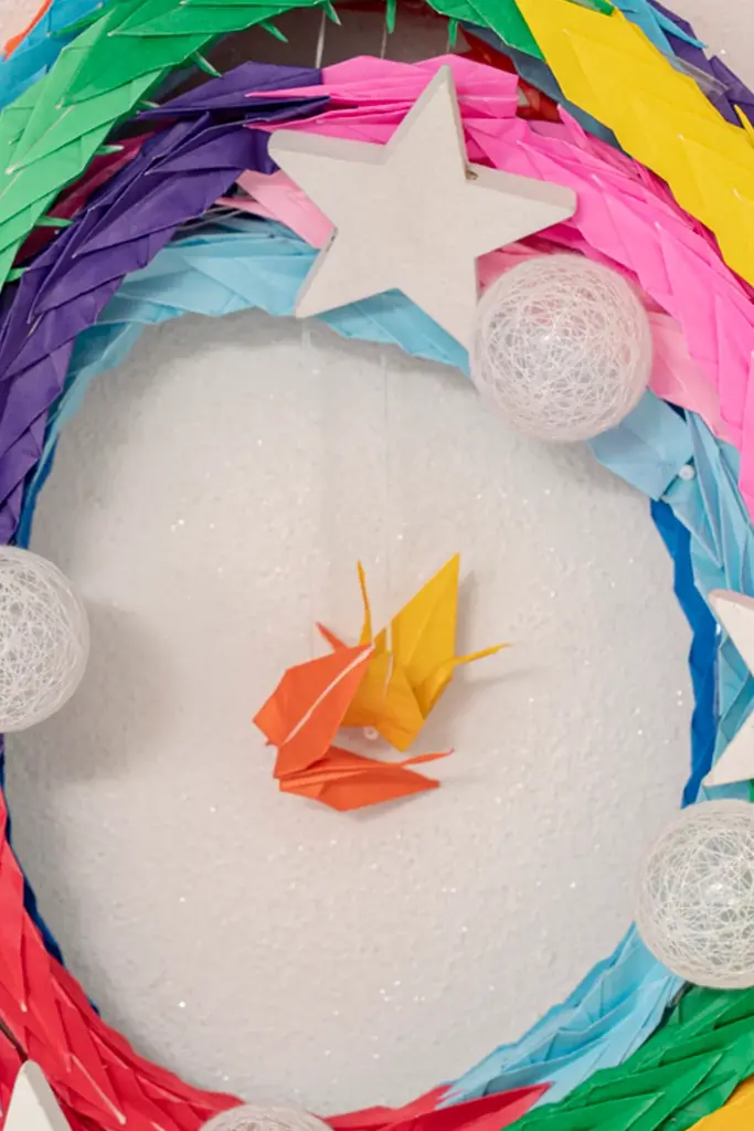 緑色の折り鶴を連ねてリースを形作り、黄色と赤色の花を咲かせることで平和なクリスマスの世界を表現しています。