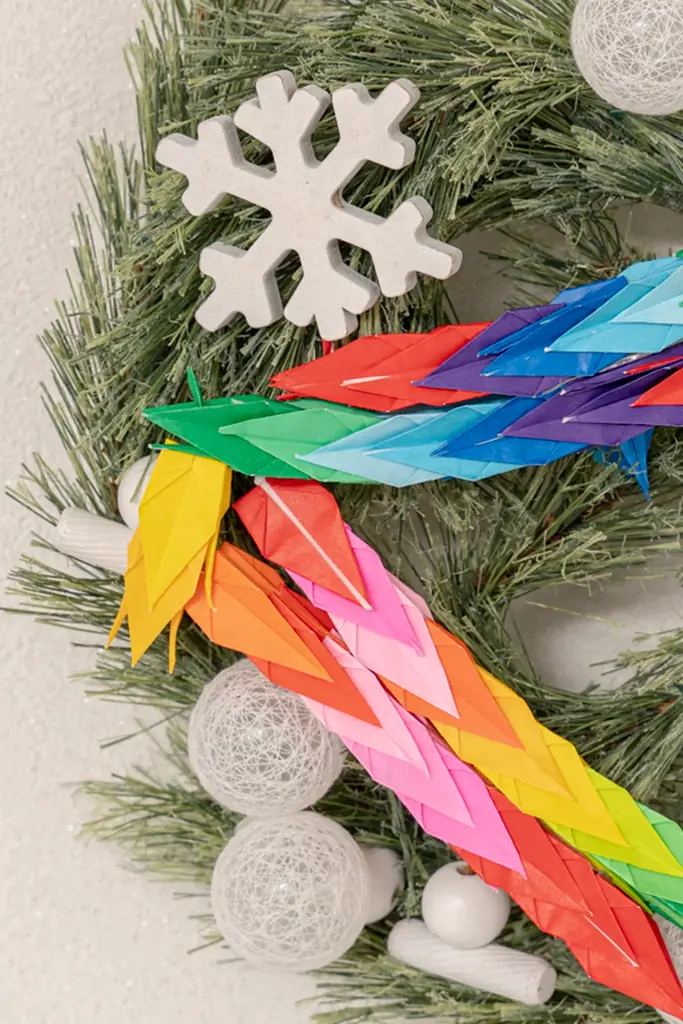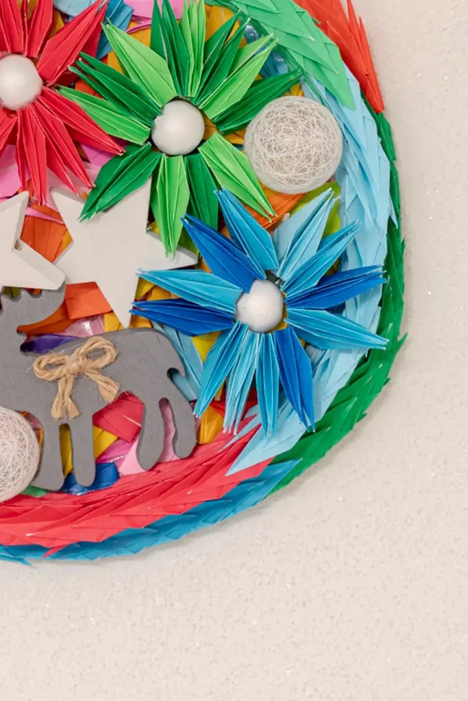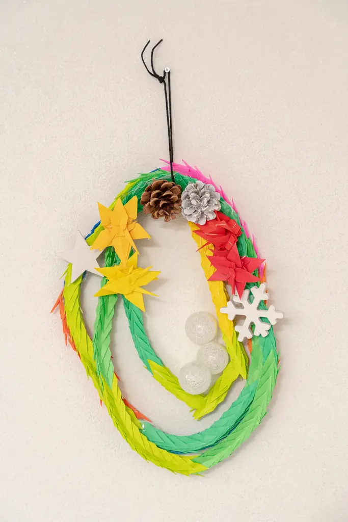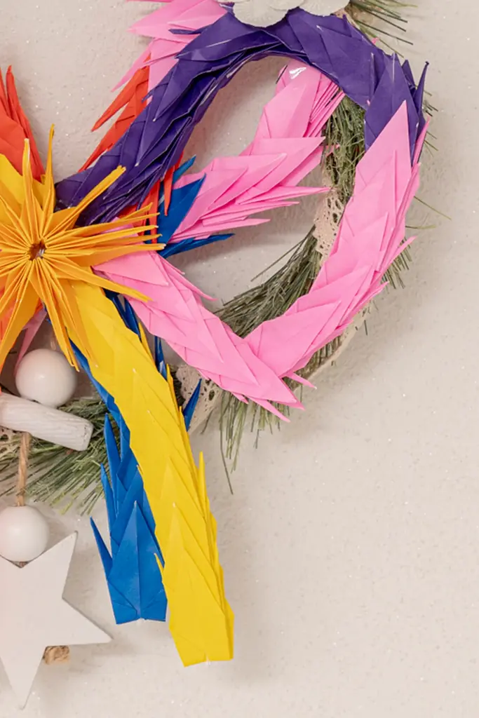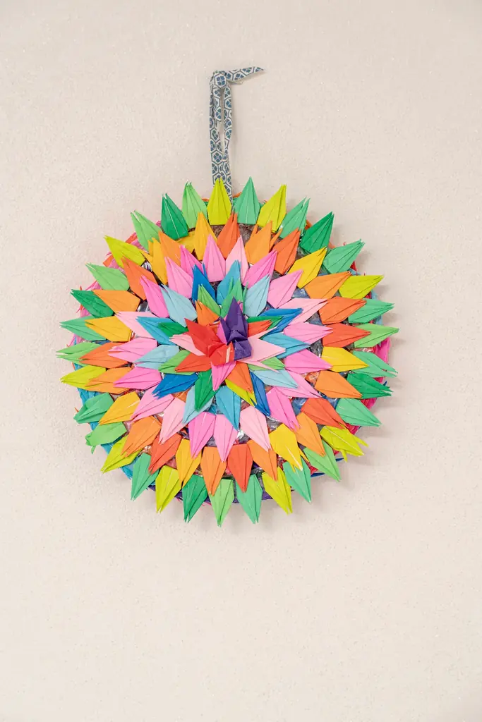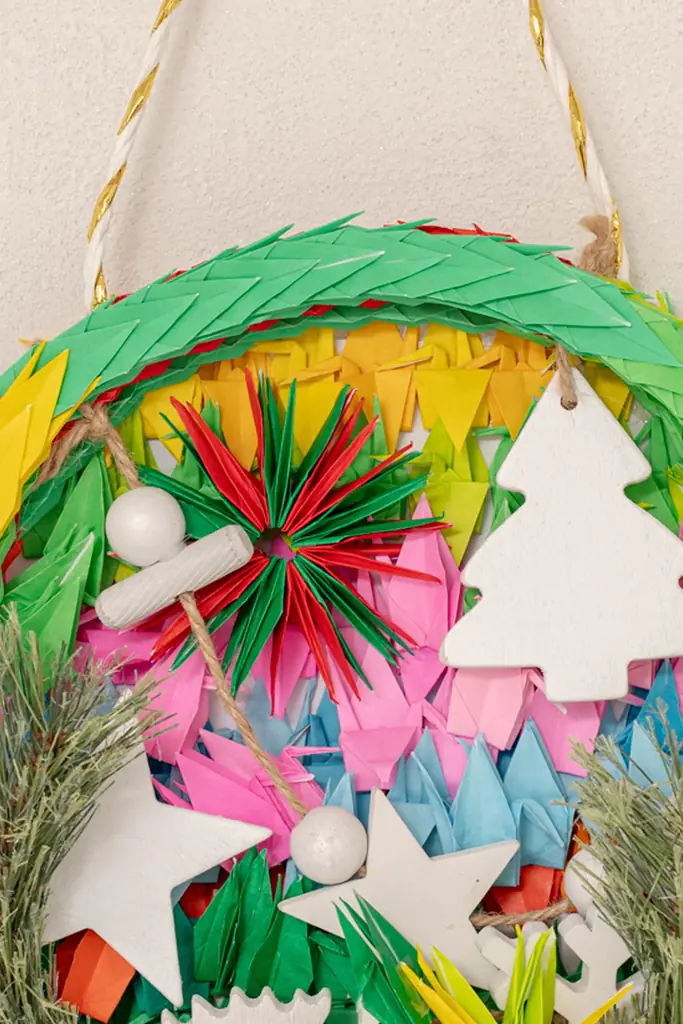 緑色の折り鶴を連ねてリースを形作り、黄色と赤色の花を咲かせることで平和なクリスマスの世界を表現しています。