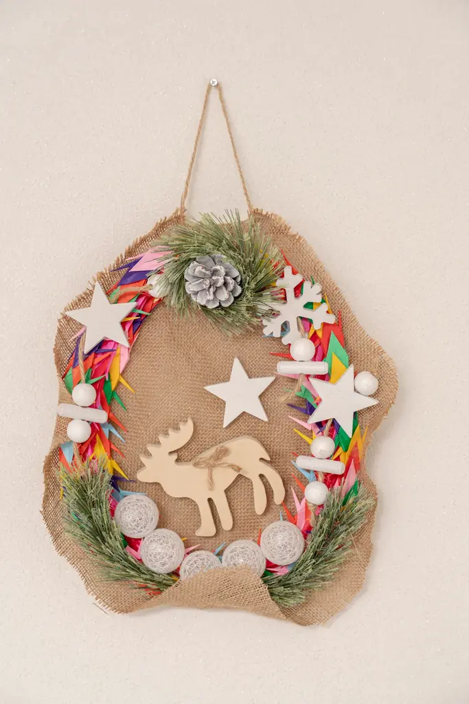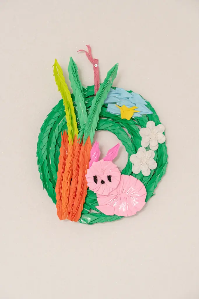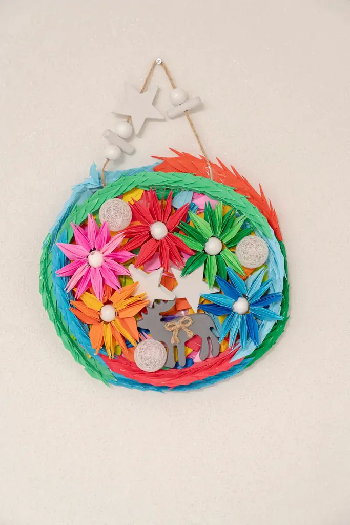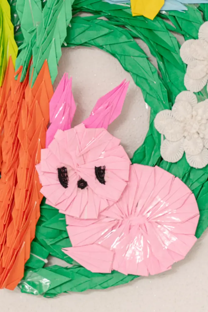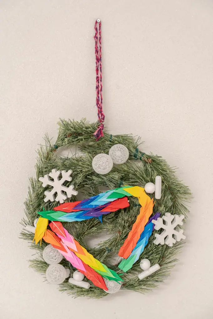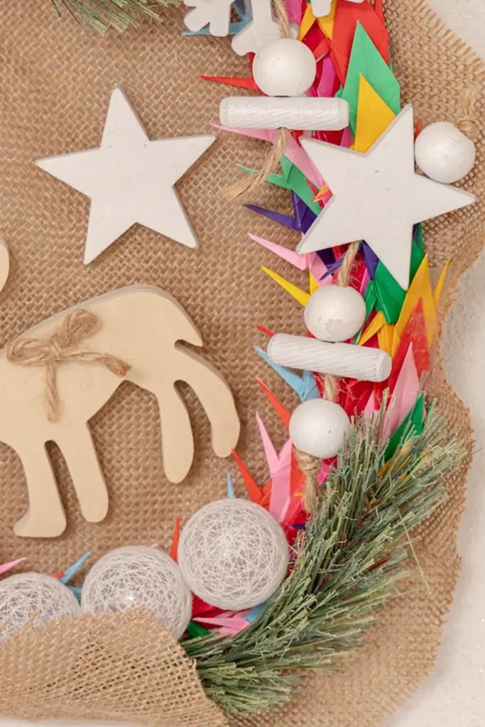 緑色の折り鶴を連ねてリースを形作り、黄色と赤色の花を咲かせることで平和なクリスマスの世界を表現しています。