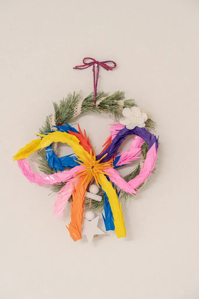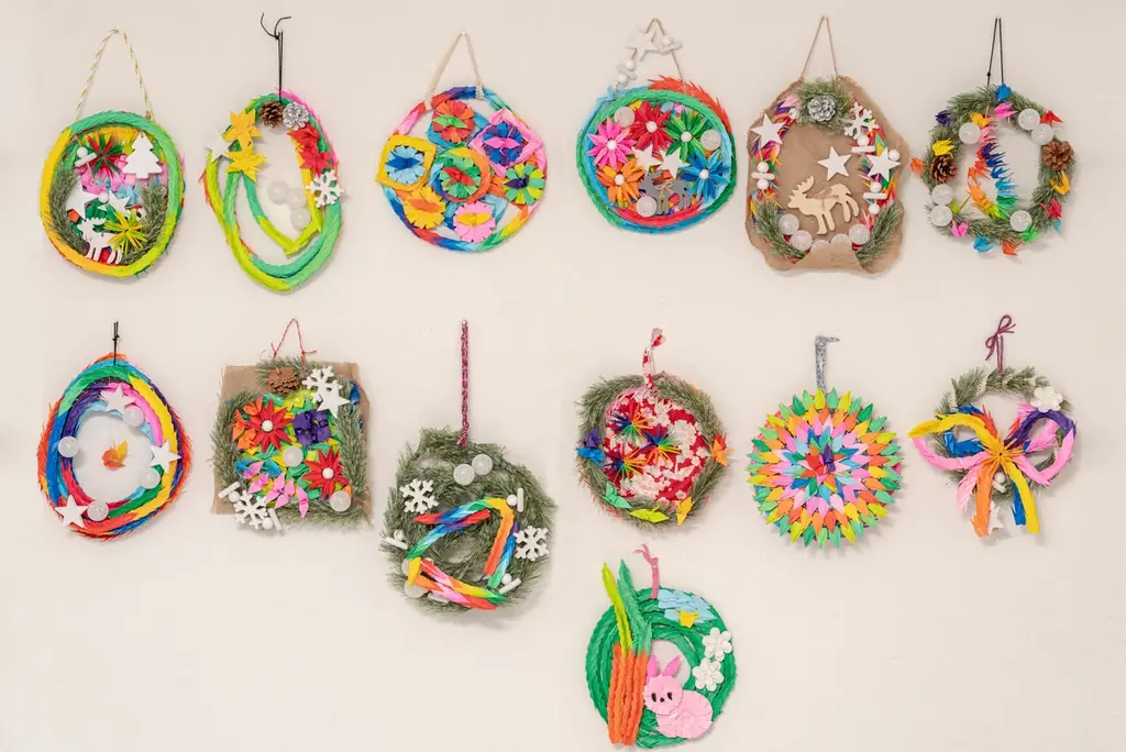 参加したスタッフは有志として、個々の感性と平和への想いを反映させた13点の作品を制作しました。各作品は素材である折り鶴の持つ象徴性を活かしつつ、クリスマスリースという季節性のあるフォーマットに落とし込んでいます。