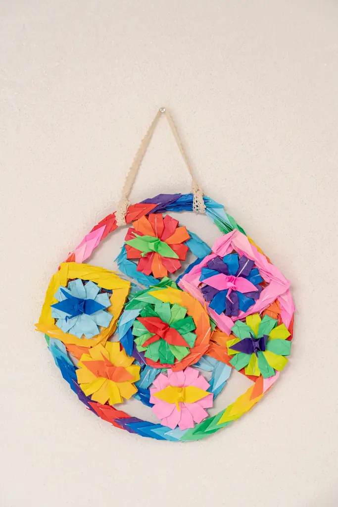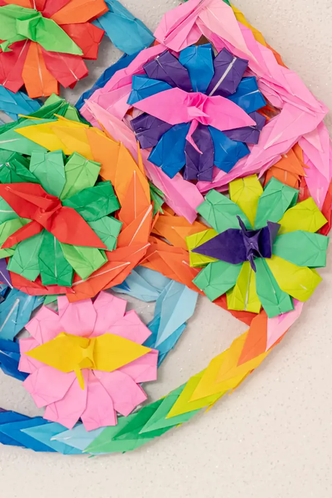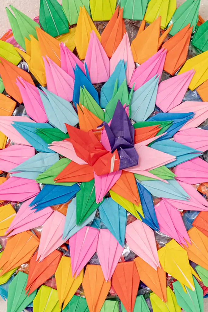 折り鶴の羽の部分を一枚一枚組み合わせ、色とりどりの「平和の花」を咲かせることを意図した作品です。