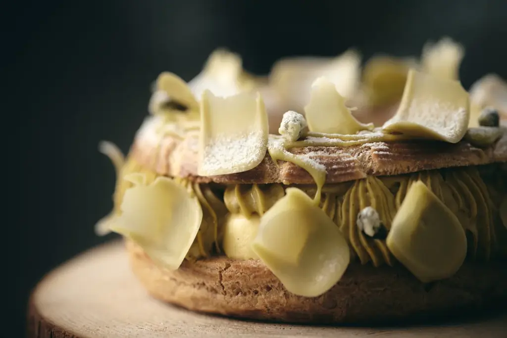 リング状に香ばしく焼き上げたシュー生地に、甘酸っぱいグリオットチェリーのクリームとコンポート、蜂蜜とバニラを効かせたクレームブリュレを重ねています。濃厚なピスタチオクリームをたっぷり絞り、ピスタチオ風味のフォンダンとホワイトチョコレートで華やかに仕立てています。