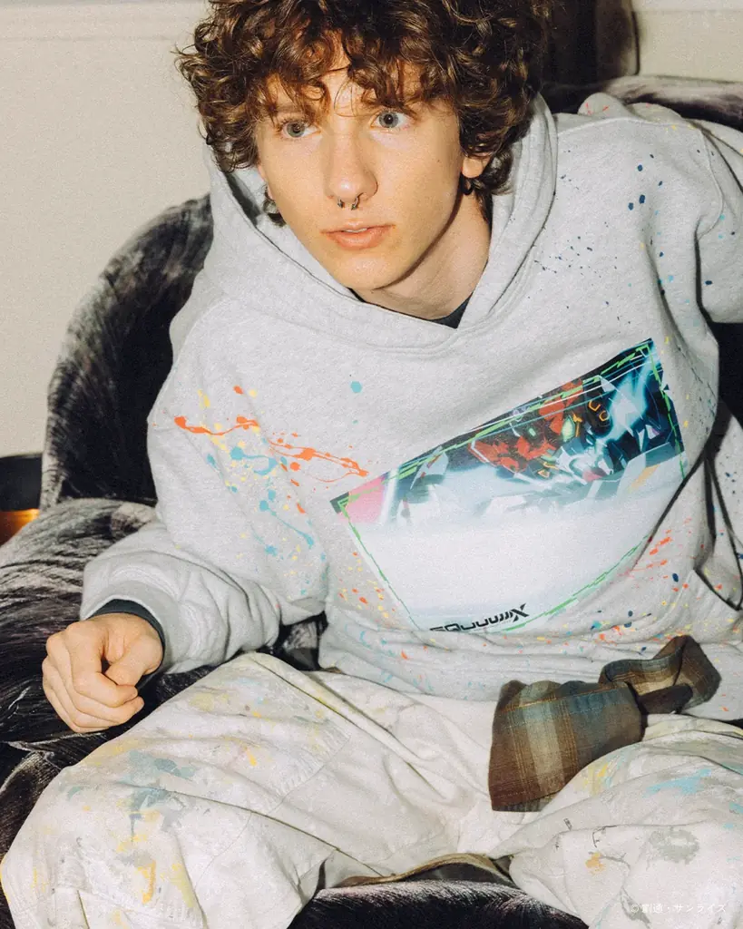 シリーズ最新作『GQuuuuuuX』からはタイトルロゴを用いたフーディや、劇中の“キラキラ”表現をアクションペインティング技法で表現した複数のフーディが登場します。ドリッピングやスパッタリングの技法により、宇宙や覚醒シーンのエネルギー感を衣服上に再現しています。