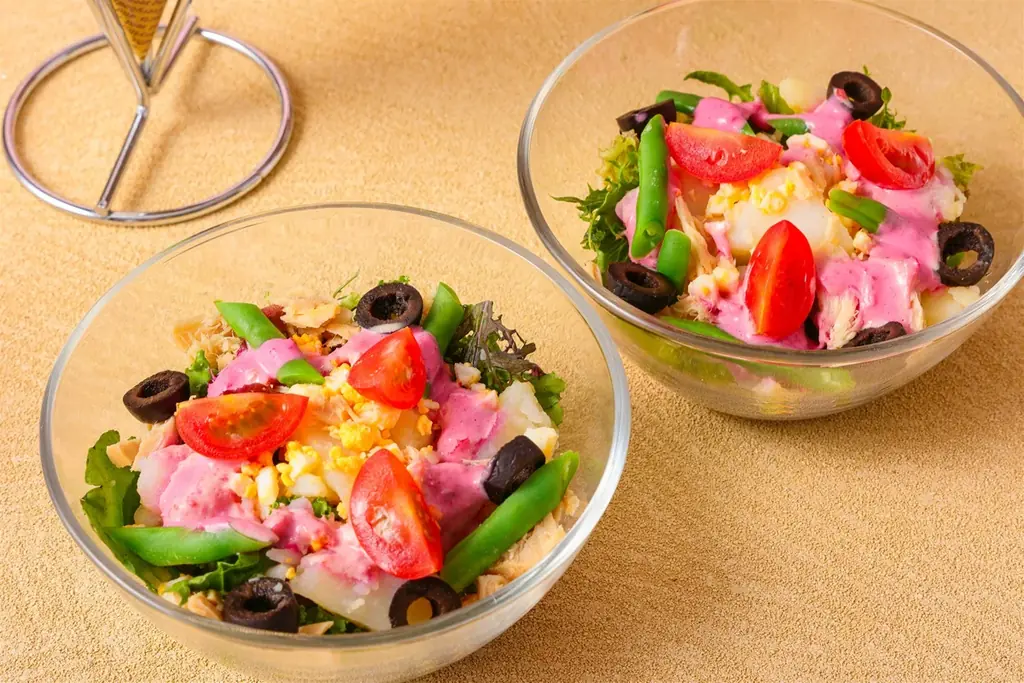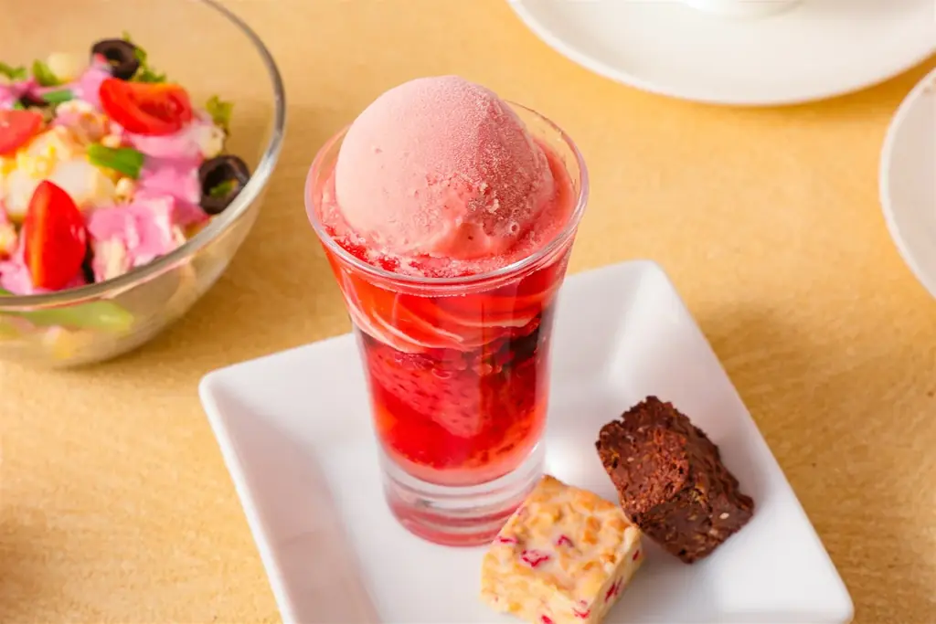 ティースタンドに含まれるメニューのほかにも、前菜やスープ、軽食的なアイテムが提供されます。昆布出汁を使ったオニオンスープやニース風ポテトサラダなど、和洋の要素を取り入れた品々が揃い、食事としての満足度を高めます。
