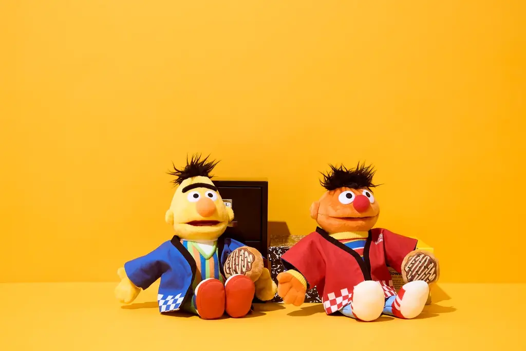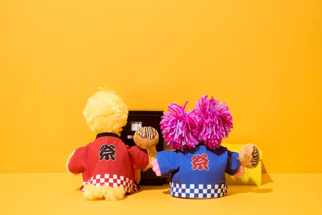 - 法被コスチューム:3,190円。市松模様を用いた和風デザイン。胸元に「SESAME STREET MARKET」ロゴ、背中に「祭」表記。赤・青のリバーシブル仕様。たこ焼きモチーフのゴムアクセサリー付き。Sサイズのぬいぐるみのみ着用可能。
