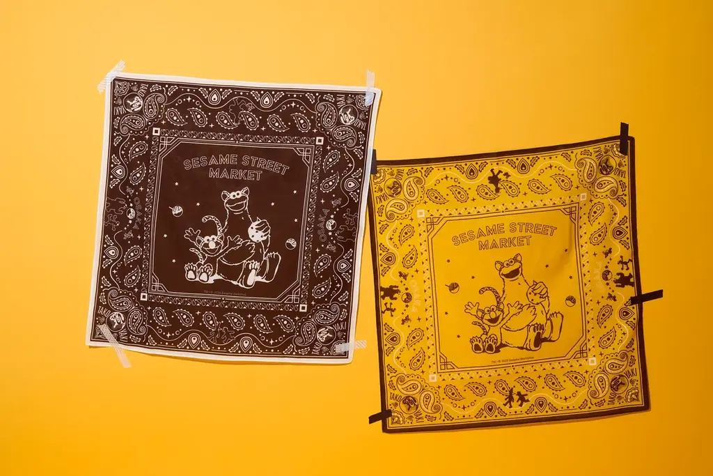 - バンダナ(ブラック/イエロー、全2種):各1,320円。トラコスチューム姿のエルモとクッキーモンスター、たこ焼きなどの大阪モチーフを散りばめたデザイン。首・髪・バッグなど多用途。