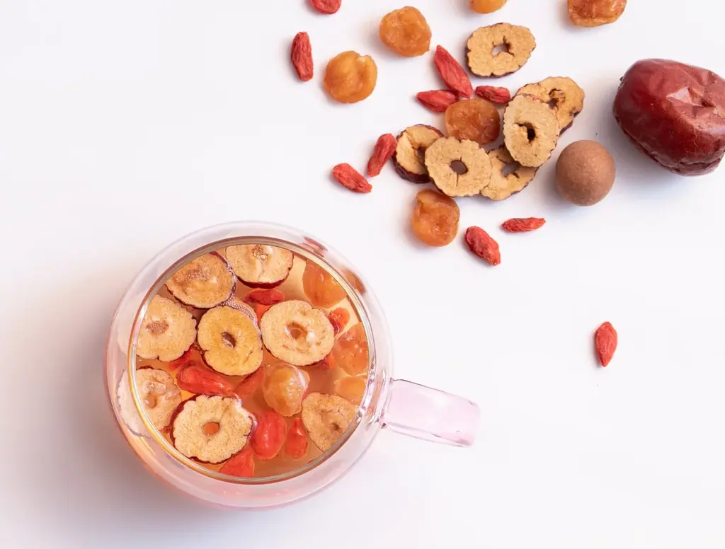 果茶は、なつめ・クコの実・ろんがん(竜眼)のドライフルーツを使用したティーで、自然な甘みがふんわり広がる点が特長です。果実が食べられる形で入っているため、飲み終わった後も果実を味わえます。