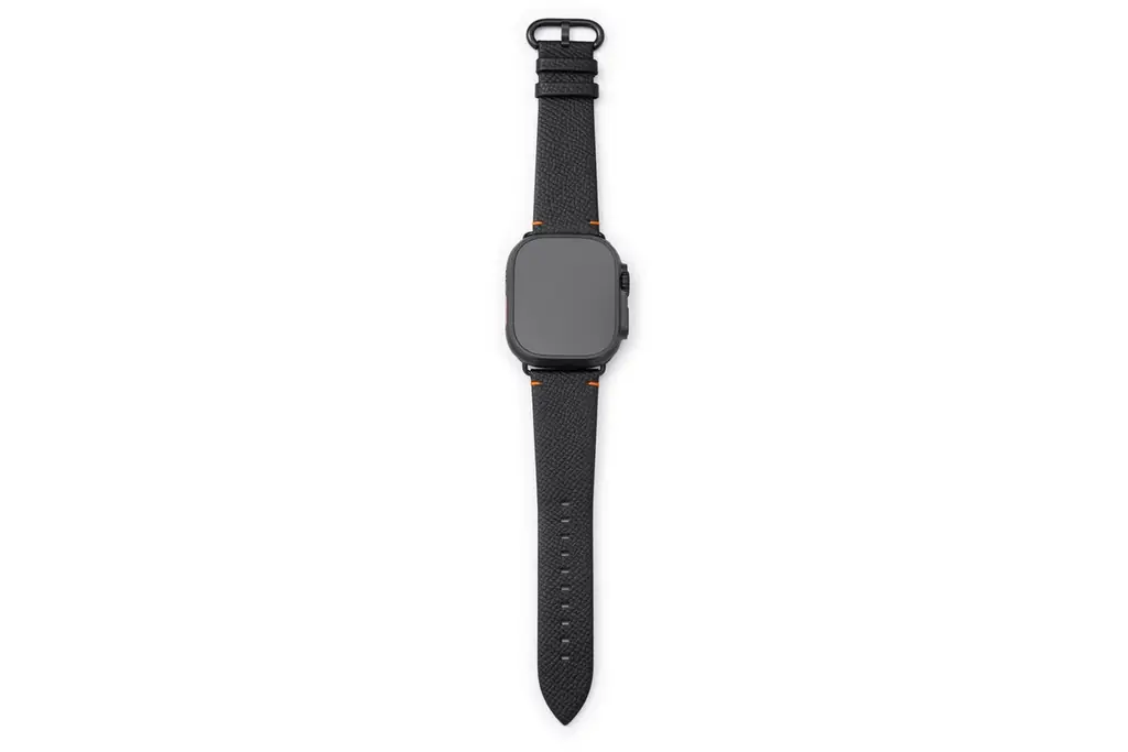 第一弾「ONYX Black × Vivid Orange」は発売直後に即完売となった実績があり、今回のV2では素材・仕様の両面で大幅なアップグレードが施されています。アップグレードの要点は、外装に採用されたフランス老舗タンナーHaas社の型押しレザー”Derby(ダービー)”と、肌に触れる裏地に採用された同社の最高級ライニングレザー”Zermatt(ツェルマット)”の組み合わせ、さらにApple Watch Ultraに合わせた専用パーツの搭載にあります。