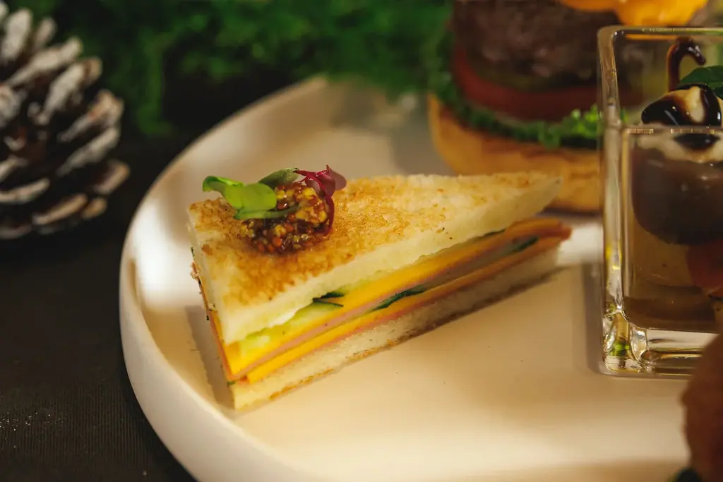 ビーツの色と風味を活かしたライスコロッケで、食感と彩りを加える役割を担います。 - モルタデッラとチェダーチーズのグルメサンド