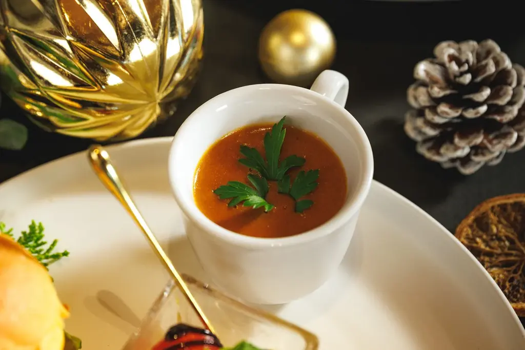チェリートマトとモッツァレラにオリーブオイルと塩胡椒を合わせ、芳醇なバルサミコグレーズでまとめたシンプルで完成度の高い一品。 - オマール海老の濃厚ビスクスープ