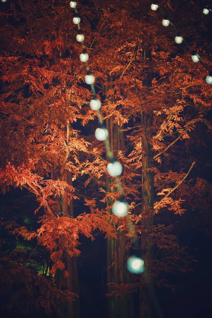 1. 紅葉ライトアップ:夜間にライトで照らされる紅葉が、色味と陰影で幻想的な表情を作り出します。