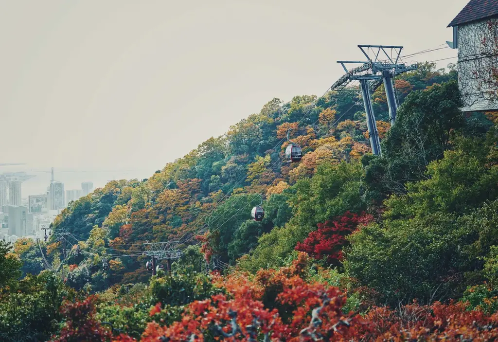 ロープウェイの車窓からは布引の滝(日本3大神滝)や五本松堰堤(ダム)を望むことができ、赤いロープウェイと紅葉のコラボレーションも写真映えする場面を多く提供します。展望プラザやガーデン各所、風の丘芝生広場からは神戸の街並みと紅葉を同時に眺めることができます。