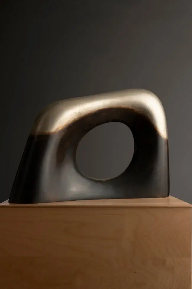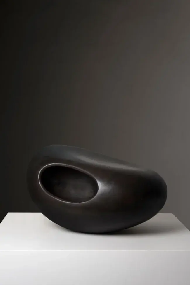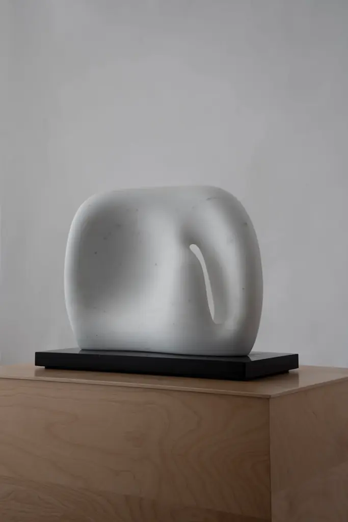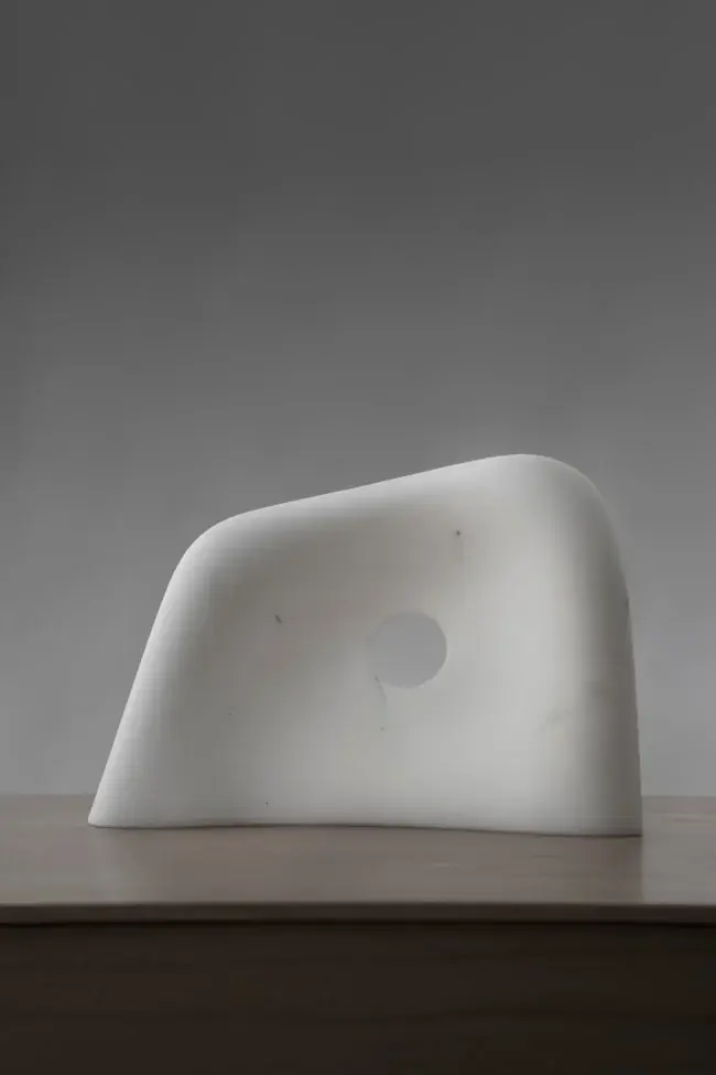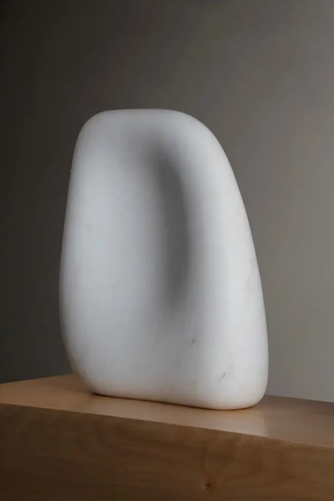安田氏の作品は主に大理石やブロンズを素材とし、研ぎ澄まされたフォルムを通じて観る者の奥底にある「無意識の形」に語りかけることが特徴です。記念碑的(monumental)な石彫作品は圧倒的な存在感を持ちながら、同時に静けさや安らぎを感じさせる性質を備えています。