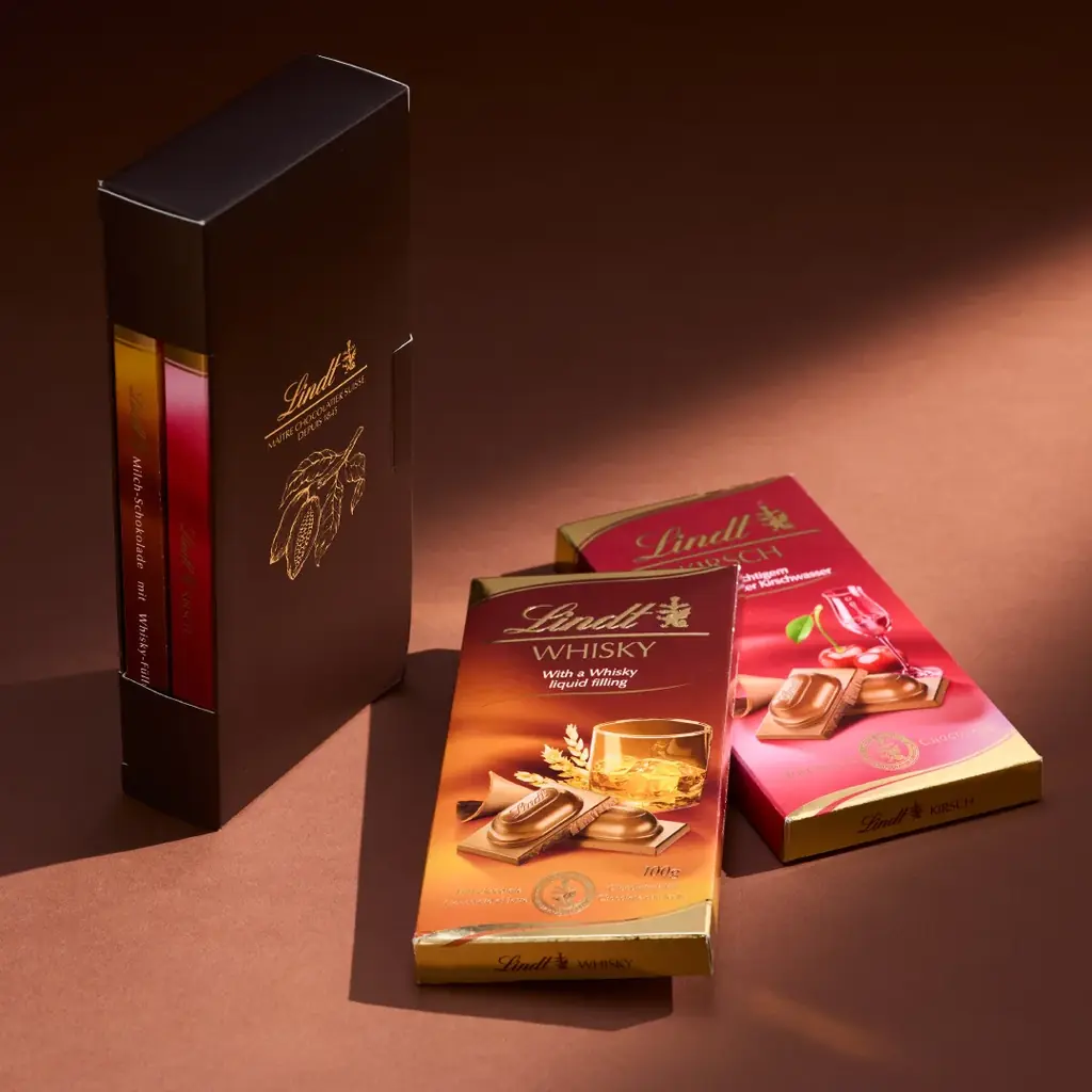 アルコールをフィリングに用いたタブレットは、大人向けの嗜好を想定した商品群です。ミルクチョコレートのなめらかな口どけから、香り高いリキッドフィリングがとろけ出す構成で、香りや余韻を楽しむことに重点が置かれています。