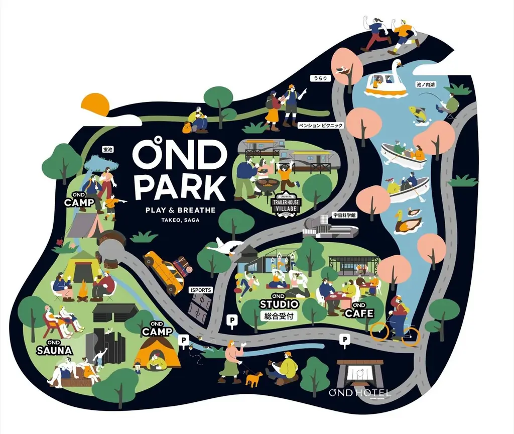OND PARKはSAUNA、STUDIO、CAFE、CAMPサイトを含むコンセプトパークとして設計され、武雄温泉保養村内に位置します。2023年4月1日に開業しており、さまざまなアクティビティが利用可能です。