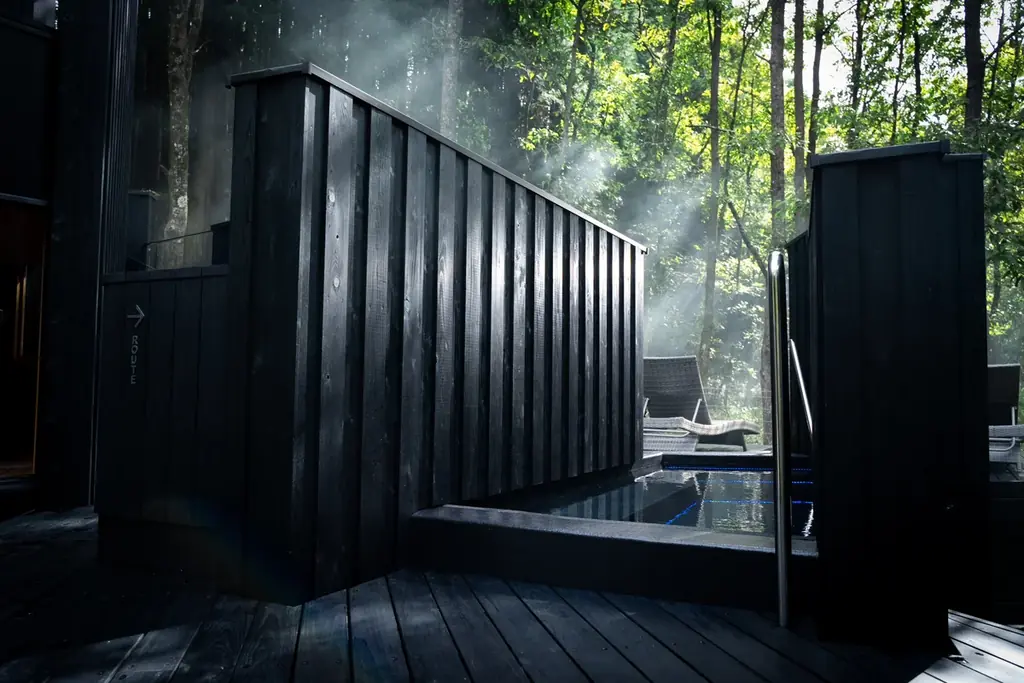OND SAUNAはOND PARK内に位置するアウトドア型サウナ施設で、解放と調和をコンセプトに自然と向き合う設計を施しています。天然水の水風呂や自然を借景にした空間設計により、四季を通じた利用体験の提供を謳っています。
