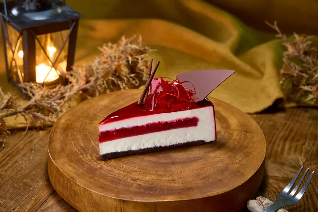 ラバラ・バリナ(デザート) サワーチェリー&ホワイトムースを用いたケーキ。綿花と針を模した特徴的なトッピングと爽やかな酸味を組み合わせた華やかな一品。