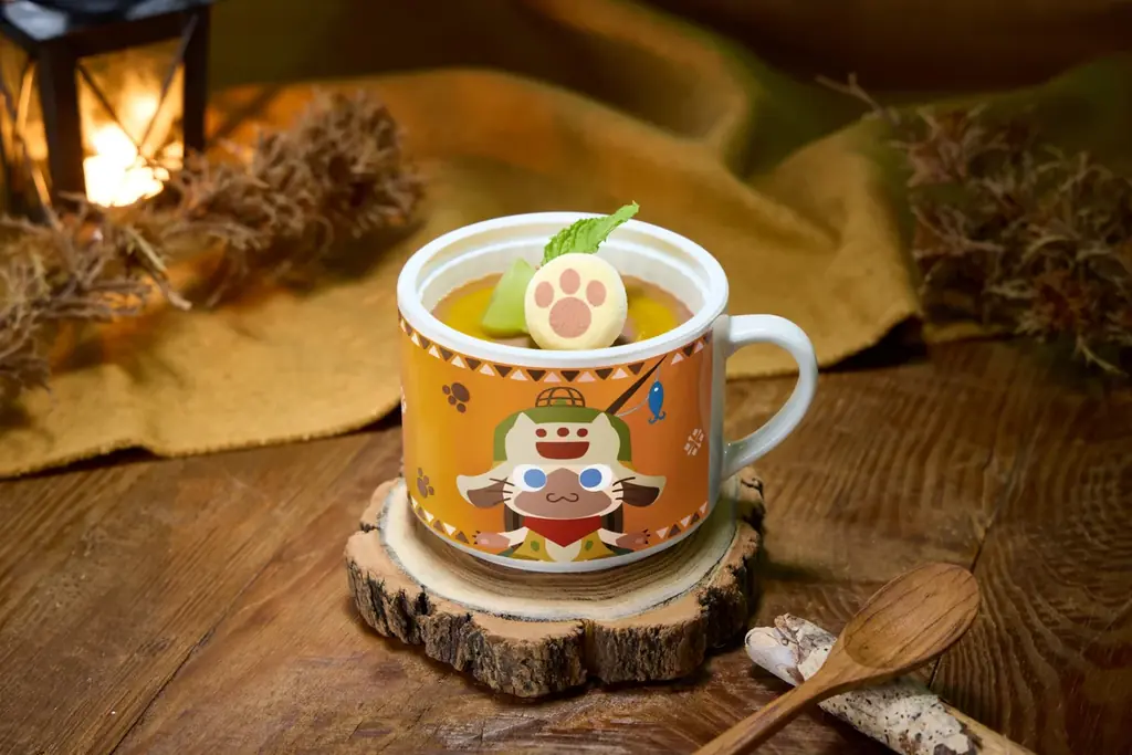 オトモアイルーのチョコレートプリン(マグカップ付) オトモアイルーをデザインしたマグカップ入りのチョコレートプリン。マシュマロ製の肉球トッピングによるぷにっとした食感が特徴。