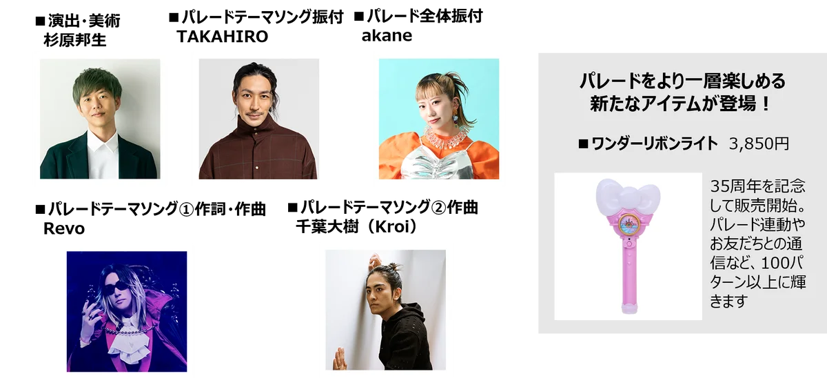 パレード制作には多彩なクリエイターが参加しています。演出・美術は杉原邦生、パレードテーマソング振付はTAKAHIRO、全体振付はakaneが担当しています。楽曲面ではRevoがテーマソング①の作詞・作曲、千葉大樹(Kroi)がテーマソング②の作曲を手がけ、音楽プロデュースはタノウエマモル(株式会社ハートカンパニー)です。