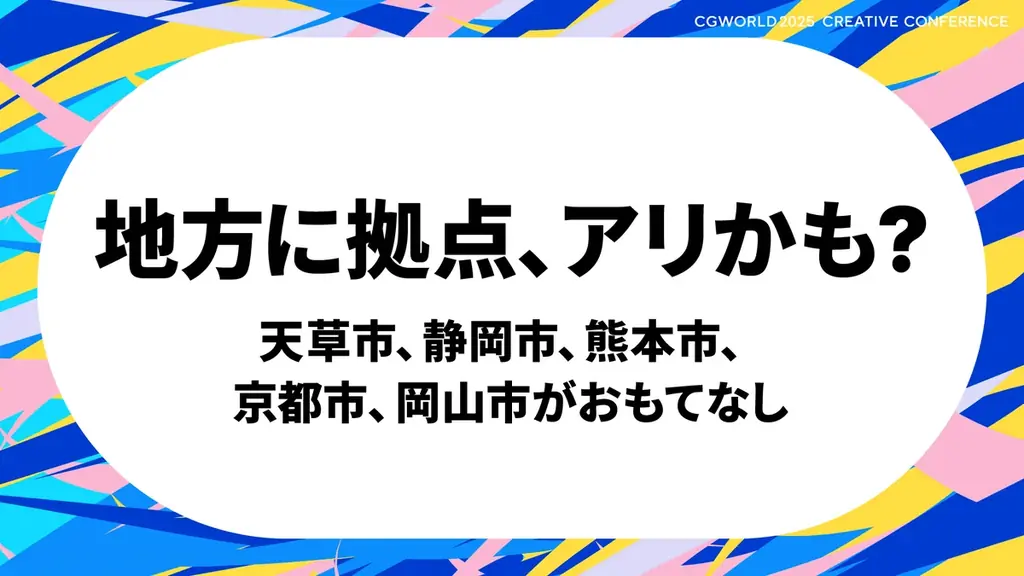 また、スタジオの地方進出やU・Iターンを検討している企業・クリエイター向けに、自治体による出展コーナーも用意されています。地方での拠点設立に関する支援施策や誘致情報を直接担当者から得られる機会となります。