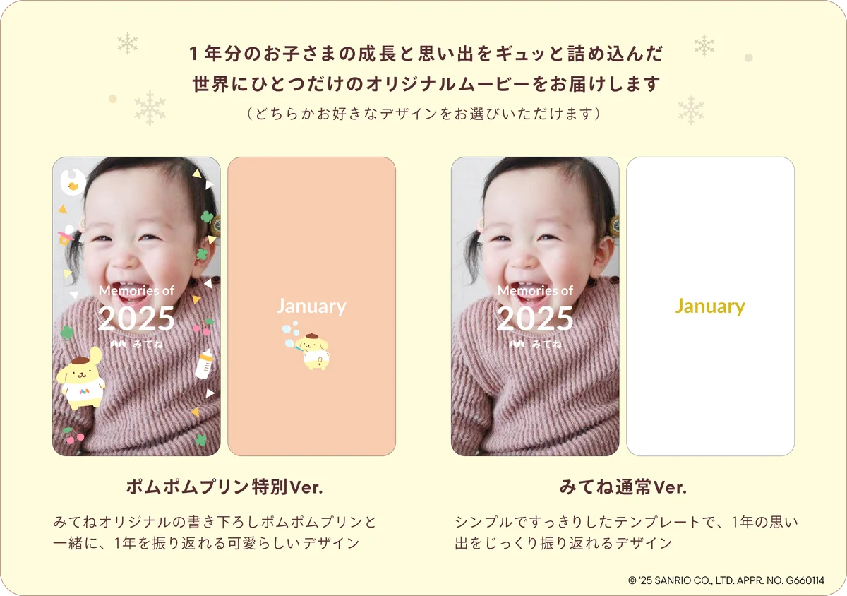 | 商標・著作権表記 | MIXIおよび「家族アルバム みてね」は株式会社MIXIの商標・登録商標。©’25 SANRIO CO., LTD. APPR. NO. G660114 |