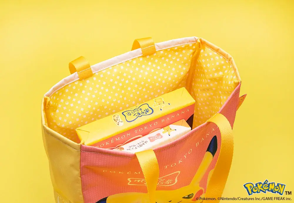 今回の目玉は、初代商品「ピカチュウ東京ばな奈」のパッケージデザインをそのままイメージしたピカチュウトートバッグです。デザインはパッケージを思い起こす配色と柄でまとめられ、内部生地は黄色でモンスターボールの模様がさりげなくあしらわれています。持ち手は長めで容量も大きく、日常使いのトートとして実用性を備えています。