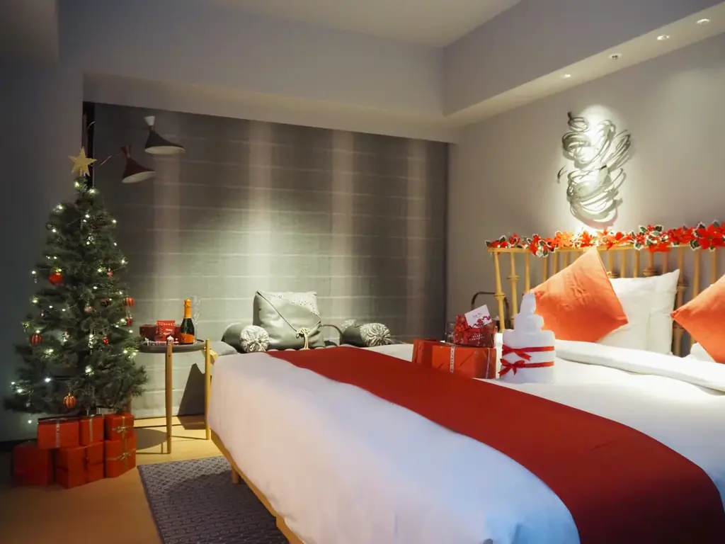 高層階の客室から京都タワーを望む1日3室限定の〈クリスマスルーム〉を設定。室内はクリスマスカラーで装飾され、スパークリングワイン(ハーフボトル)とプチギフトが付帯します。宿泊タイプは朝食付き、デイユース、ディナー付きの3プランを用意しており、カップルや家族旅行に対応しています。