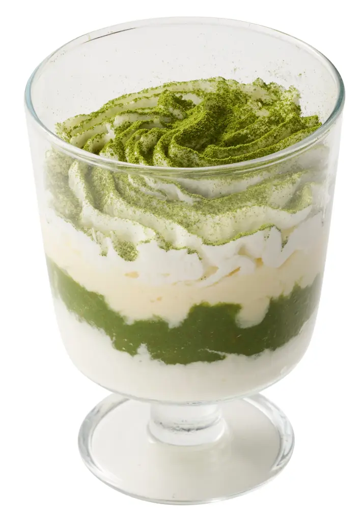 価格:¥490。ホイップクリーム、抹茶風味のスポンジケーキ、ティラミスクリームを重ね、仕上げに抹茶パウダーを振りかけた濃厚なティラミス風のパフェです。