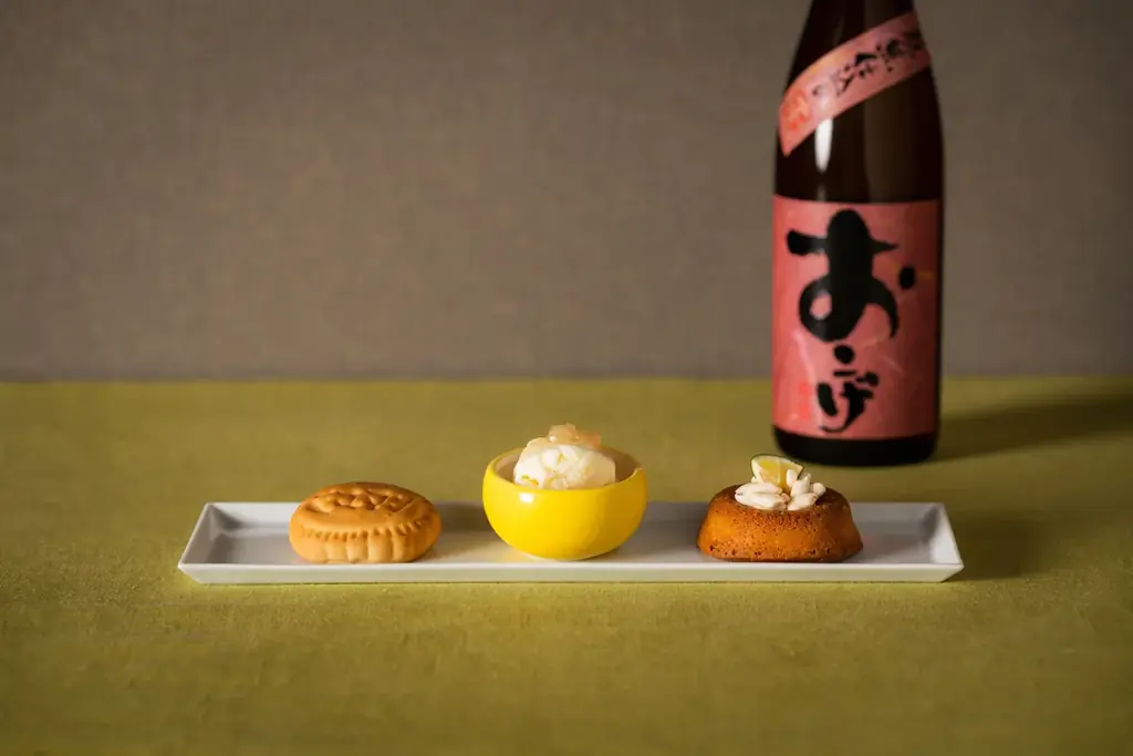 界 別府のセットは、チョコバナナやりんご飴を連想させる出店の定番スイーツをあしらったサバランが中心です。かぼす香る麦焼酎シロップで爽やかな風味を与え、臼杵せんべい(*3)や小豆の葛バーを添えて、別府の温泉街のそぞろ歩きを表現しています。