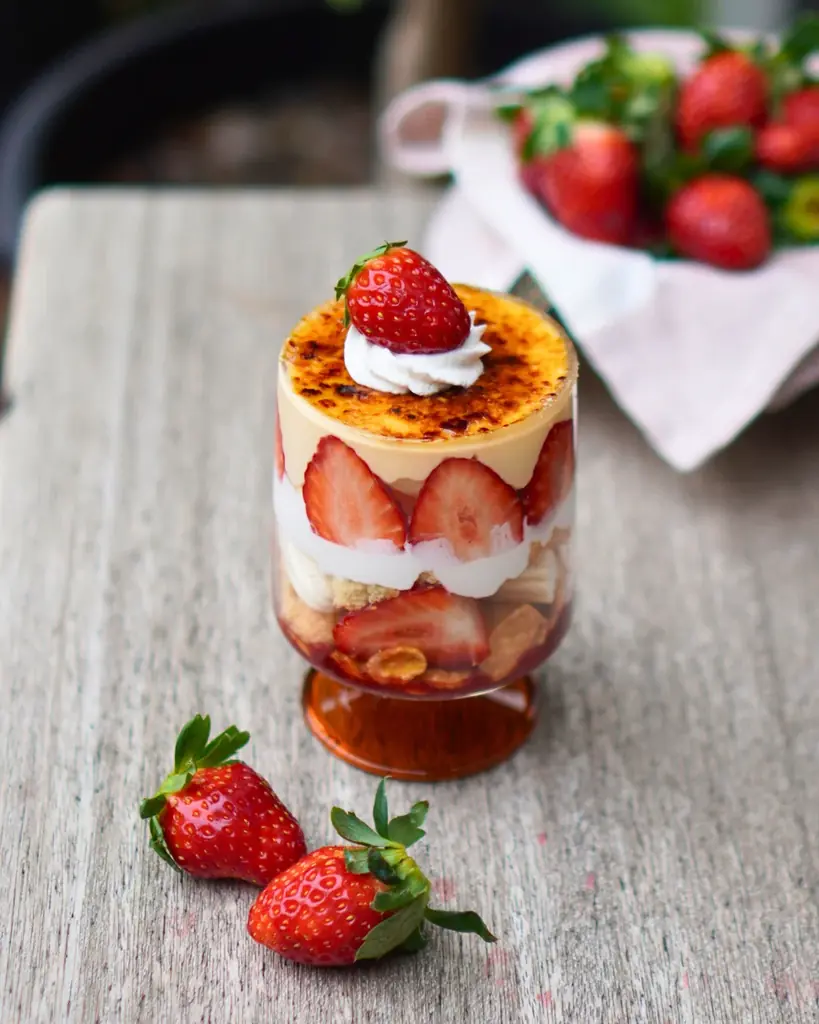 • 特徴:パリパリのきび砂糖ブリュレ、自家製いちごアイス、サクサクのメレンゲを組み合わせたパフェ。完熟いちごのおいしさを一口ごとに堪能できる構成。