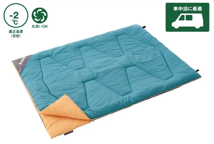 「ミニバンピッタリ寝袋・-2 BD」は、適正温度が-2℃まで対応する保温性を持ち、ミニバンの室内サイズに合わせた設計が特長です。連結してダブルサイズとして使用でき、分離すれば2つの寝袋として使える分離型の構造を採用しています。