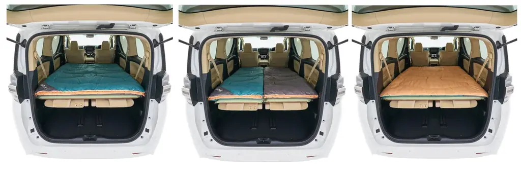 - 車中泊の基本配置:連結状態(ダブル)でミニバン室内に敷いて親子や複数の就寝スペースを確保。