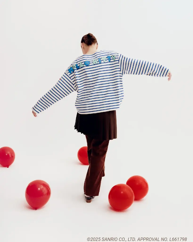 | Item13 | HELLO KITTYボーダーカットソー | ¥14,300 | WHT,PNK,BLK | F | バックに大きなロゴプリント、左袖にワンポイント刺繍、ゆったりした身幅 |