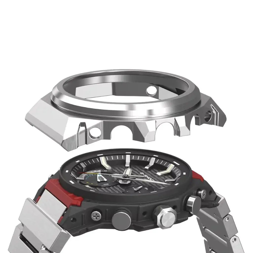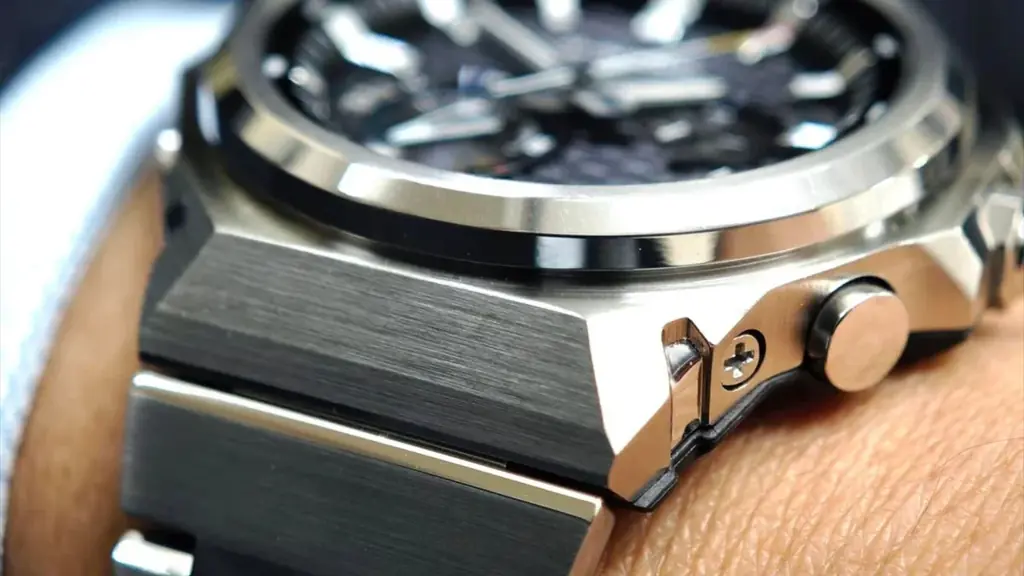 GST-B1000D-1AJFは外観のミニマルさだけでなく、内部構造にもG-SHOCKの堅牢性を継承しています。メタルベゼルが衝撃の外側をガードし、ケース本体にはカーボンファイバー強化樹脂を採用。メタルの質感と樹脂の衝撃吸収性を組み合わせることで、薄型化と耐衝撃性の両立を実現しています。