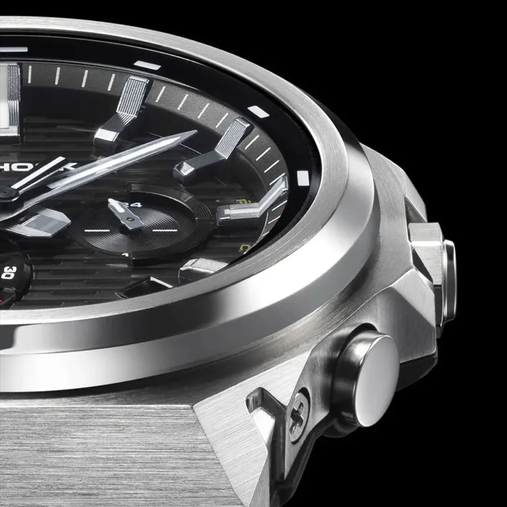 ロゴを配さないベゼルは、直線と円形のヘアライン、ミラー仕上げの三種の磨き分けにより、見る角度や光の当たり方で静かに表情を変えます。ベゼルの造形と仕上げだけで“G-SHOCKらしさ”を表現するというアプローチは、G-STEELシリーズにおける新たなデザインコードと言えます。
