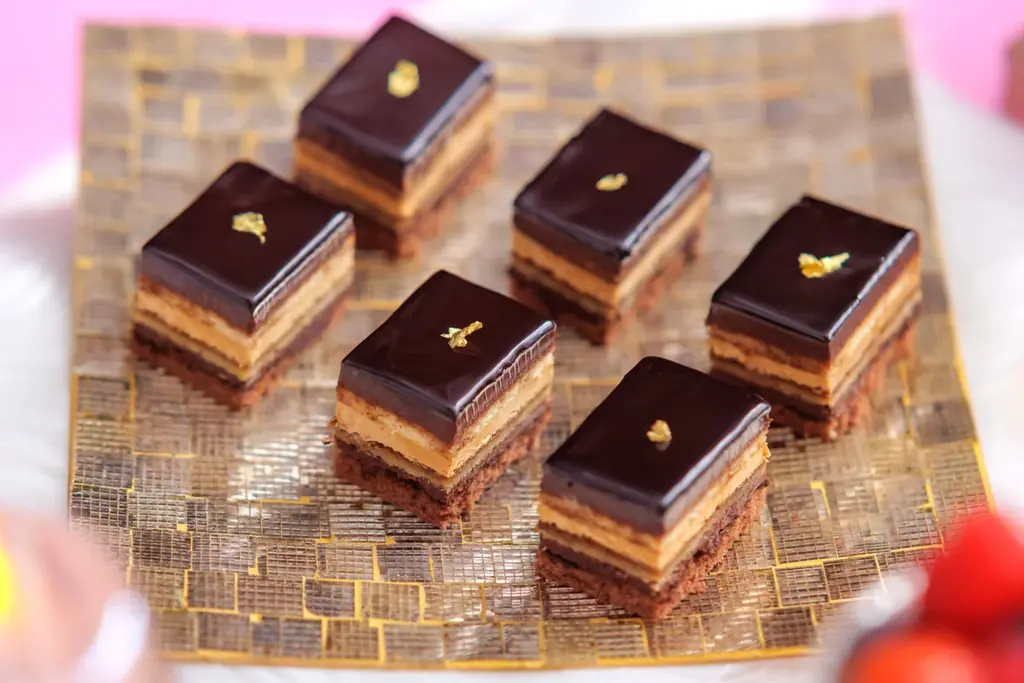 - オペラ:コロンビア産チョコレートガナッシュを使った超濃厚な層、アーモンド生地、シロップを染み込ませた生地、バニラクリームを含めた全8層仕立て。食感の変化とチョコレートの香りを重視。