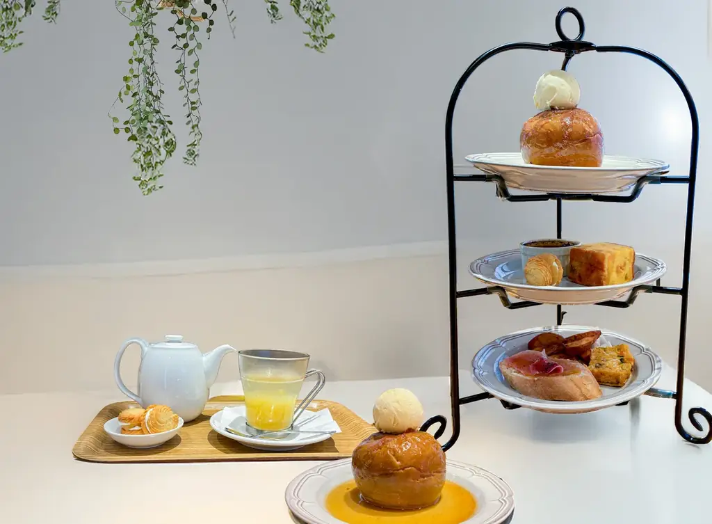中段のスイーツや下段の惣菜の一部は、近鉄八尾カフェ店のレジ横でテイクアウト販売も実施します。自宅でもアフタヌーンティーの一部を楽しめる構成です。