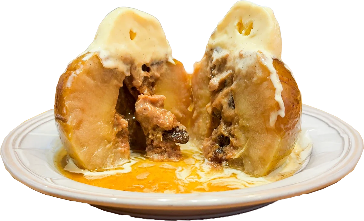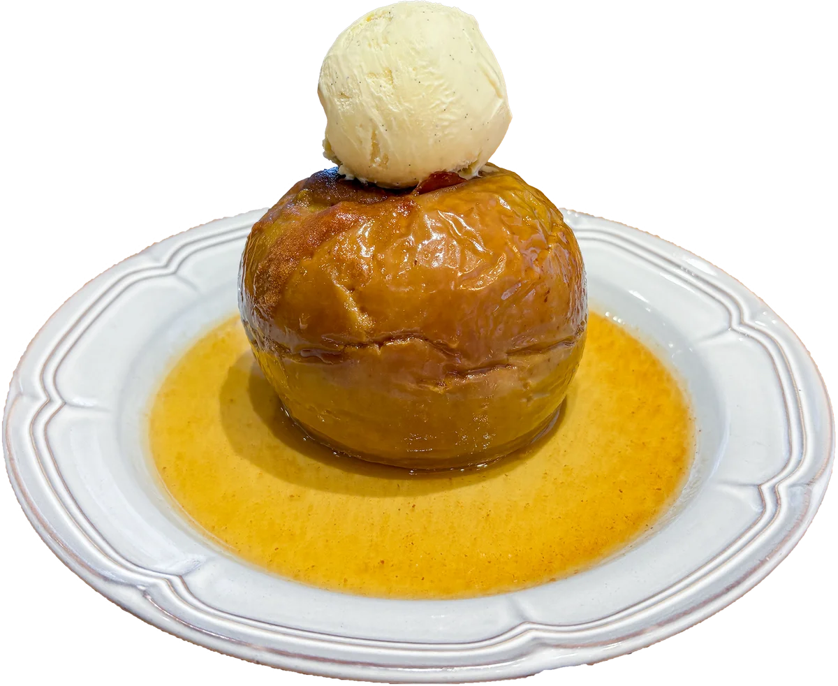 看板商品としてこれまで毎年販売されている焼きりんごを今回も提供します。りんご1個の芯をくり抜き、自家製のシナモン風味ダマンド、クルミ、レーズンを詰めてじっくり焼き上げます。仕上げにバニラアイスをのせることで、熱と冷のコントラストを楽しめる構成になっています。