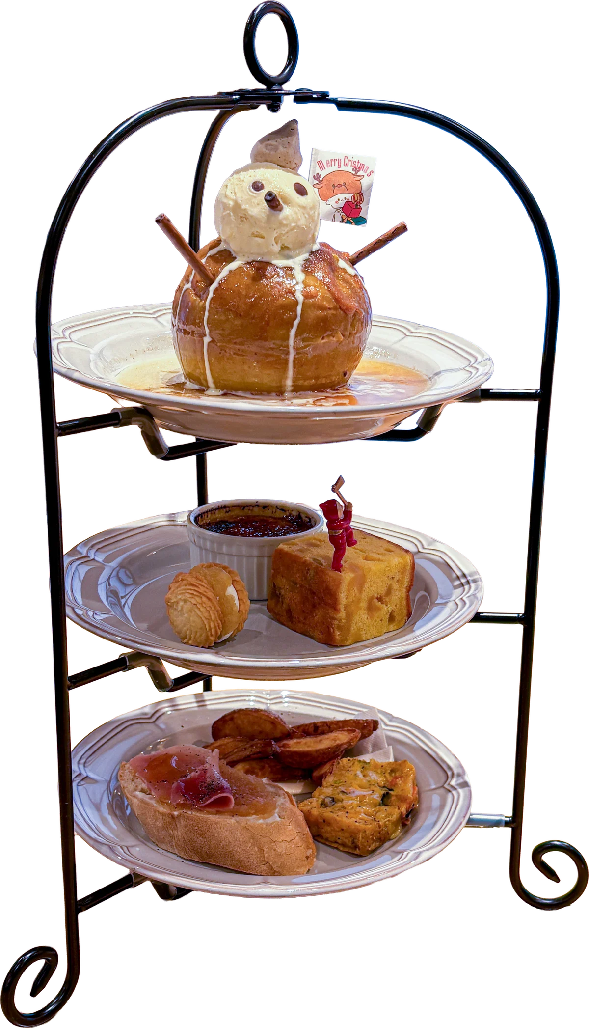 12月のクリスマス期間には、単品の「まるっと焼きりんご」と「りんごのアフタヌーン」の上段に載る焼きりんごが期間限定で雪だるま(メレンゲクッキーの帽子とチョコの顔)に変身します。ビジュアル面で季節感を演出する限定仕様です。
