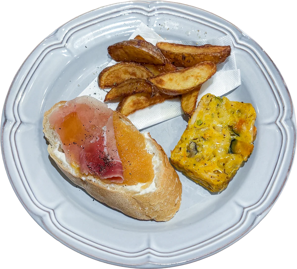 | 下段 | いろいろ野菜とチキンのケークサレ、りんごと生ハムのブルスケッタ、ポテト |
